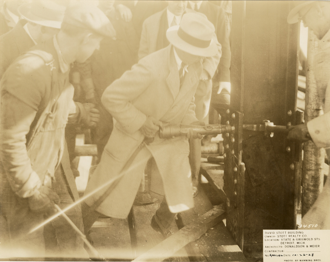 View of a man, wearing an overcoat and hat, bolting a girder on the David Stott Building during construction. Other men stand nearby. The Stott Building was designed by Donaldson and Meier. Printed on front: "David Stott Building. Owner: Stott Realty Co. Location: State & Griswold Sts. Detroit, Mich. Architects: Donaldson & Meier. Contractor: Martin-Krausmann Co. No. Special. Date: 10-26-28. Photo by Manning Bros."