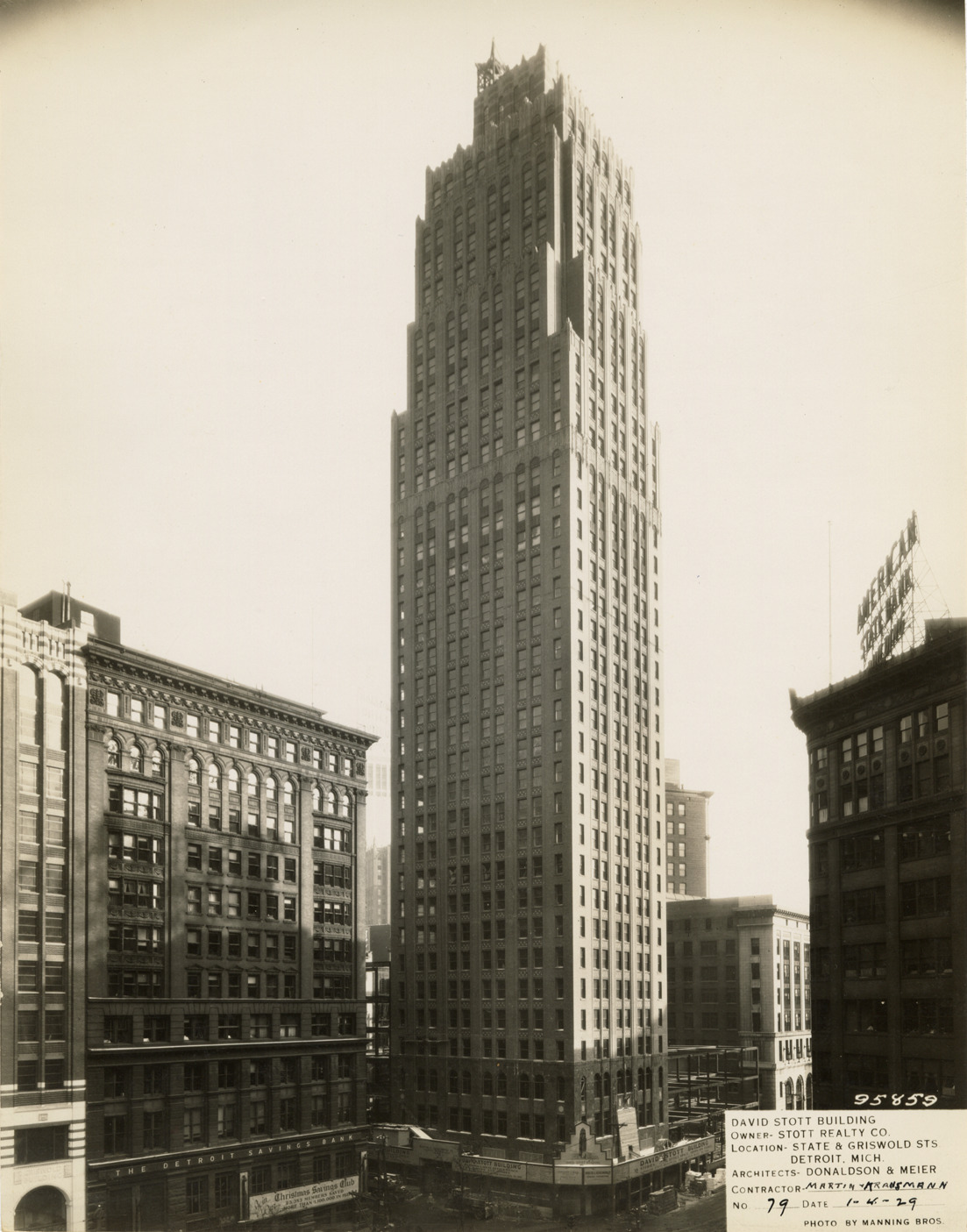 View of the David Stott Building during construction. Detroit Savings Bank and American State Bank in foreground. The Stott Building was designed by Donaldson and Meier. Printed on front: "David Stott Building. Owner: Stott Realty Co. Location: State & Griswold Sts. Detroit, Mich. Architects: Donaldson & Meier. Contractor: Martin-Krausmann Co. No. 79. Date: 1-4-29. Photo by Manning Bros."