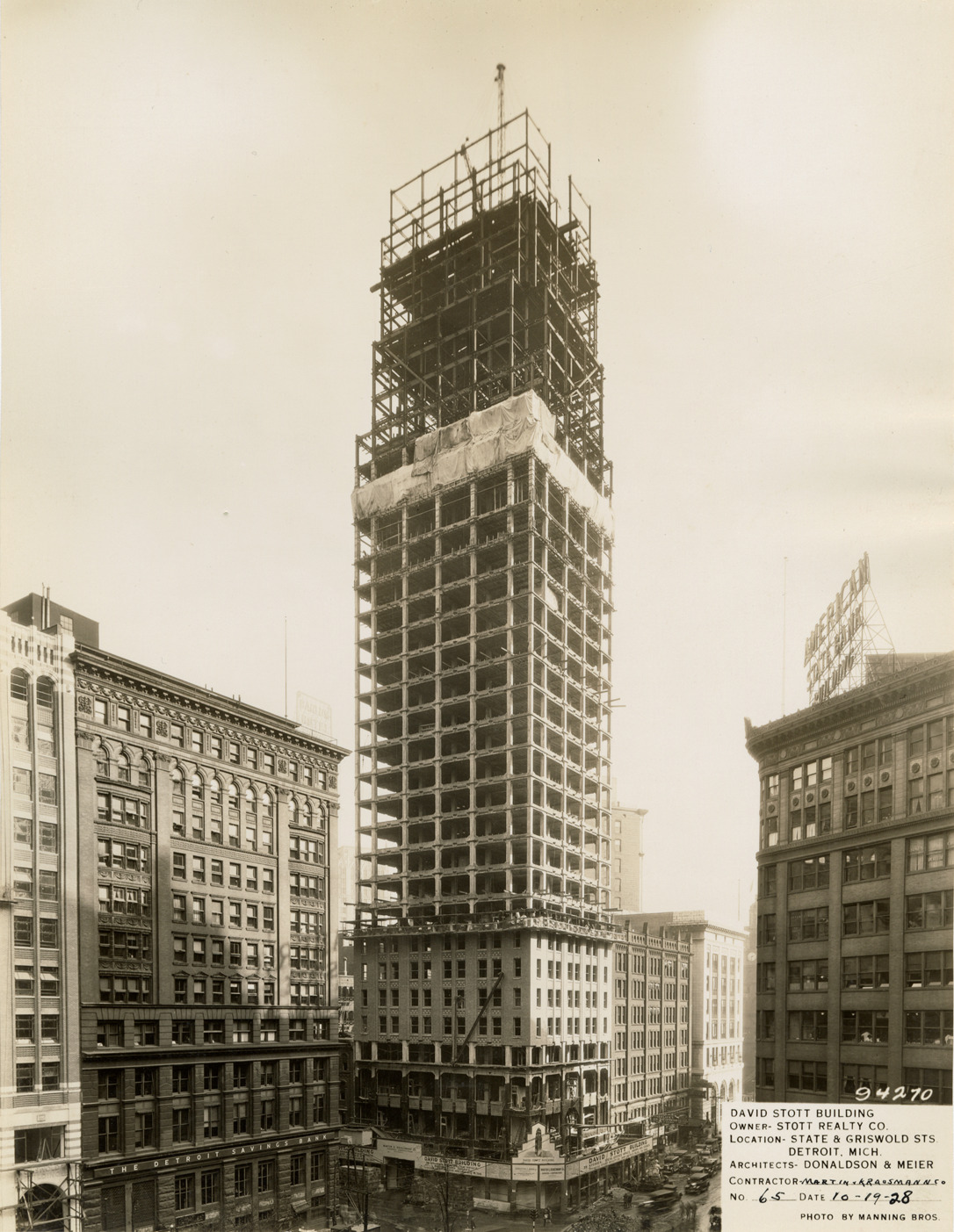 View of the David Stott Building during construction, showing structural framework. Detroit Savings Bank and American State Bank in foreground. The Stott Building was designed by Donaldson and Meier. Printed on front: "David Stott Building. Owner: Stott Realty Co. Location: State & Griswold Sts. Detroit, Mich. Architects: Donaldson & Meier. Contractor: Martin-Krausmann Co. No. 65. Date: 10-19-28. Photo by Manning Bros."