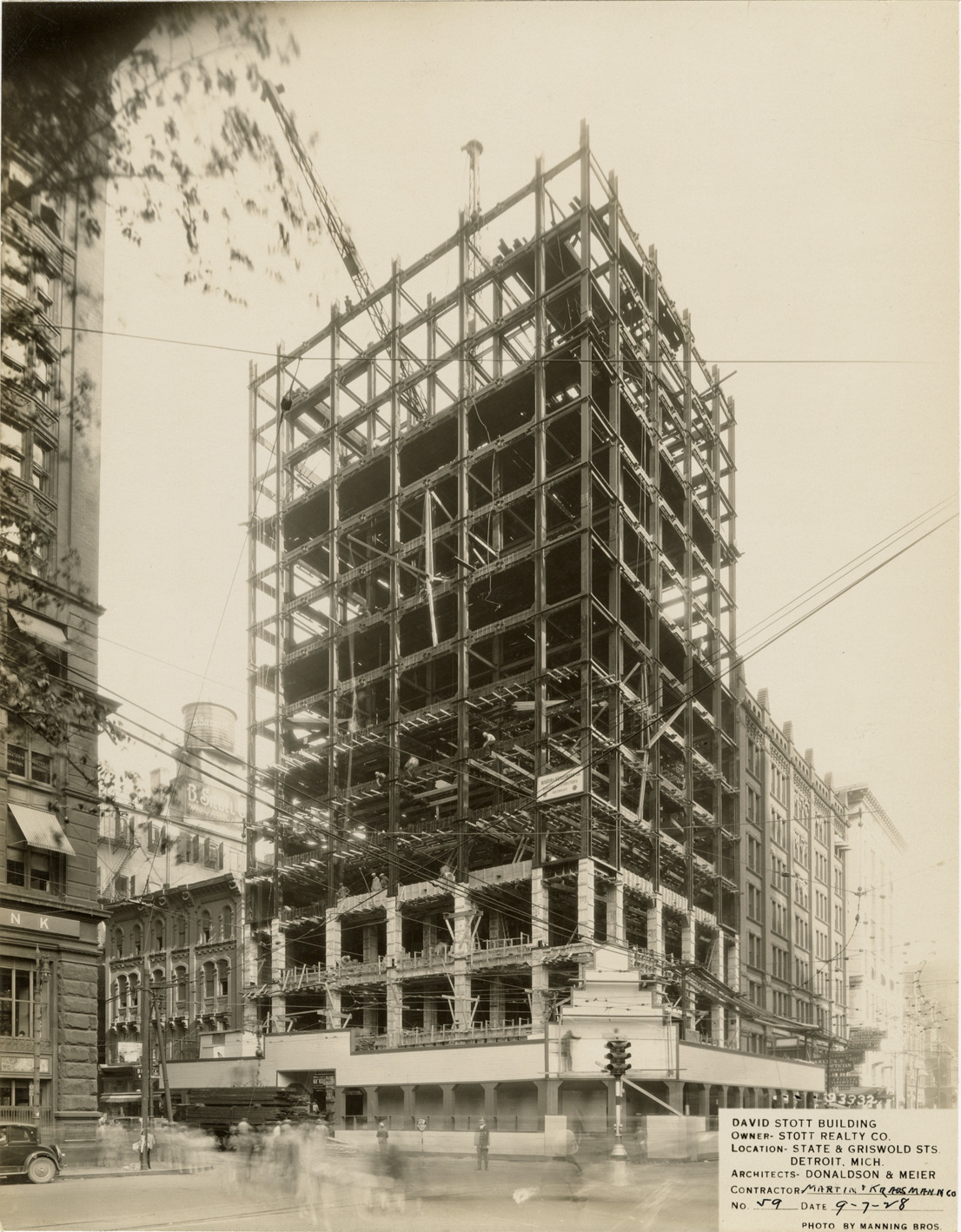 View of the David Stott Building during construction, showing structural framework. The Stott Building was designed by Donaldson and Meier. Printed on front: "David Stott Building. Owner: Stott Realty Co. Location: State & Griswold Sts. Detroit, Mich. Architects: Donaldson & Meier. Contractor: Martin-Krausmann Co. No. 59. Date: 9-7-28. Photo by Manning Bros."