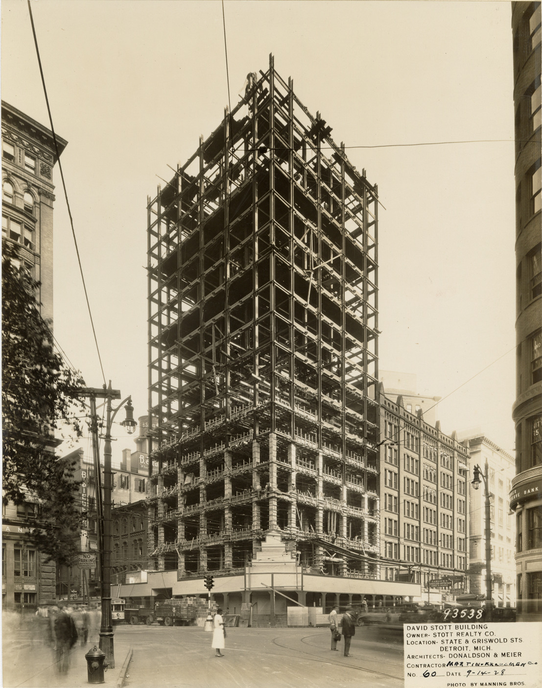 View of the David Stott Building during construction, showing structural framework. The Stott Building was designed by Donaldson and Meier. Printed on front: "David Stott Building. Owner: Stott Realty Co. Location: State & Griswold Sts. Detroit, Mich. Architects: Donaldson & Meier. Contractor: Martin-Krausmann Co. No. 60. Date: 9-14-28. Photo by Manning Bros."