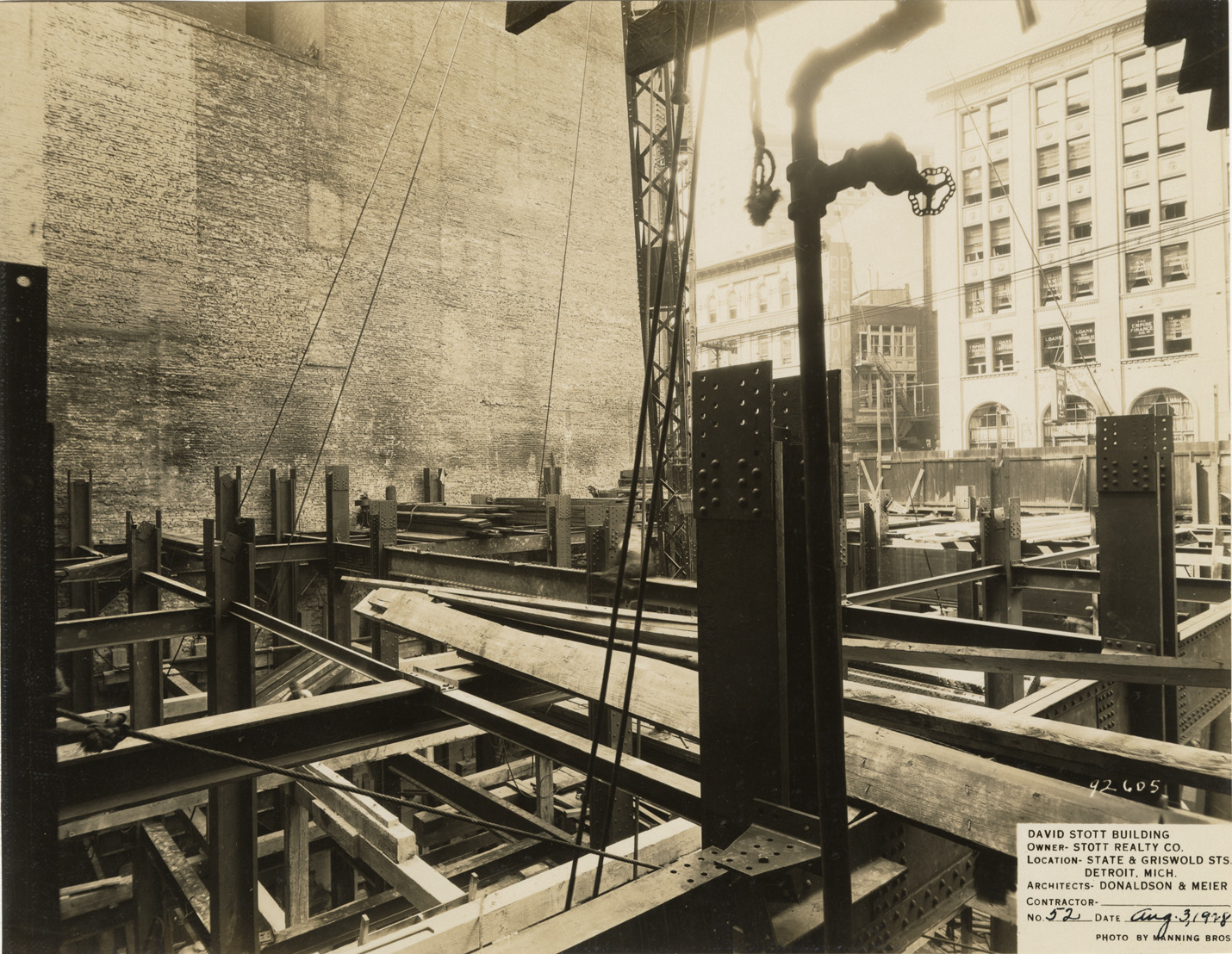 Close-up view of the David Stott Building during construction, showing structural framework. The Stott Building was designed by Donaldson and Meier. Printed on front: "David Stott Building. Owner: Stott Realty Co. Location: State & Griswold Sts. Detroit, Mich. Architects: Donaldson & Meier. Contractor: Martin-Krausmann Co. No. 52. Date: Aug. 3, 1928. Photo by Manning Bros."
