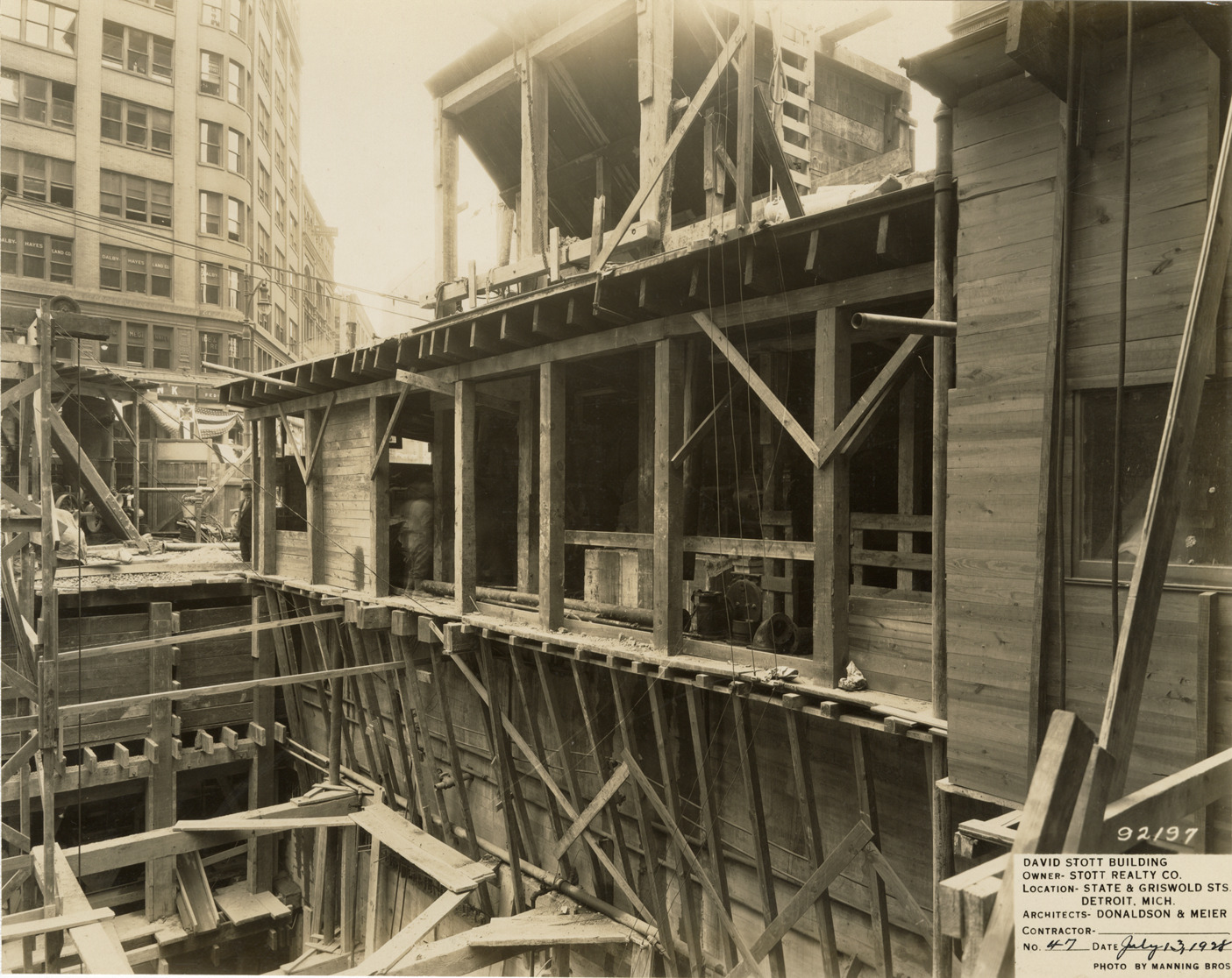 View of temporary structure over foundation for the David Stott Building during construction. The Stott Building was designed by Donaldson and Meier. Printed on front: "David Stott Building. Owner: Stott Realty Co. Location: State & Griswold Sts. Detroit, Mich. Architects: Donaldson & Meier. Contractor: Martin-Krausmann Co. No. 47. Date: July 13, 1928. Photo by Manning Bros."