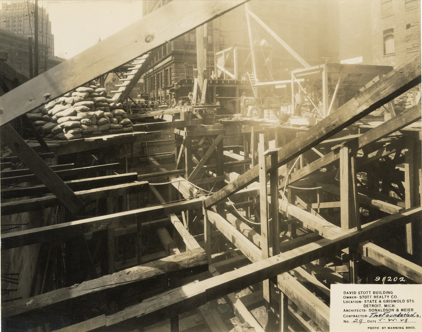 View of the foundation for the David Stott Building during construction. Pile of sandbags in background. The Stott Building was designed by Donaldson and Meier. Printed on front: "David Stott Building. Owner: Stott Realty Co. Location: State & Griswold Sts. Detroit, Mich. Architects: Donaldson & Meier. Contractor: The Foundation Co. No. 29. Date: 5-25-28. Photo by Manning Bros."