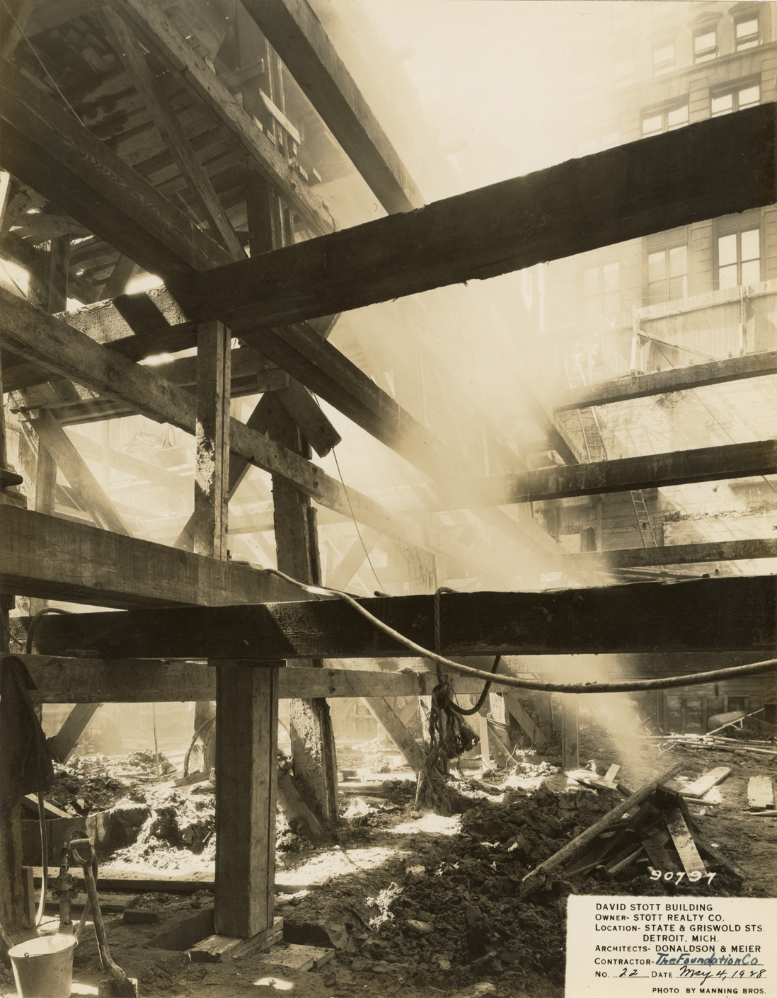 View of the foundation for the David Stott Building during construction. The Stott Building was designed by Donaldson and Meier. Printed on front: "David Stott Building. Owner: Stott Realty Co. Location: State & Griswold Sts. Detroit, Mich. Architects: Donaldson & Meier. Contractor: The Foundation Co. No. 22. Date: May 4, 1928. Photo by Manning Bros."