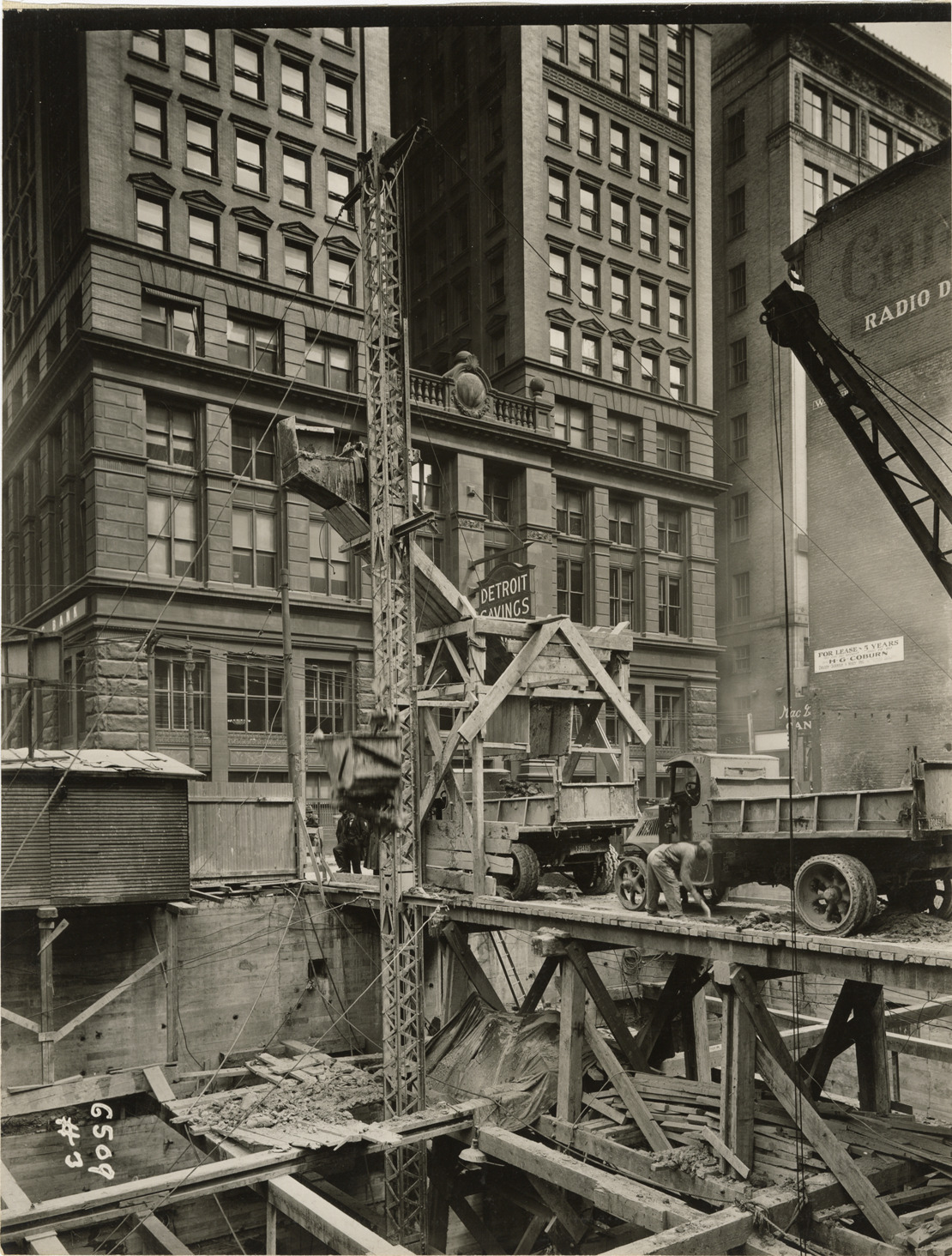 View of a mast hoist used for excavating the foundation for the David Stott Building. Truck on right. The Stott Building was designed by Donaldson and Meier. Typed on back: "Illustrations showing mast hoist equipment as used in Detroit for elevating dirt from a basement excavation and loading same into trucks."