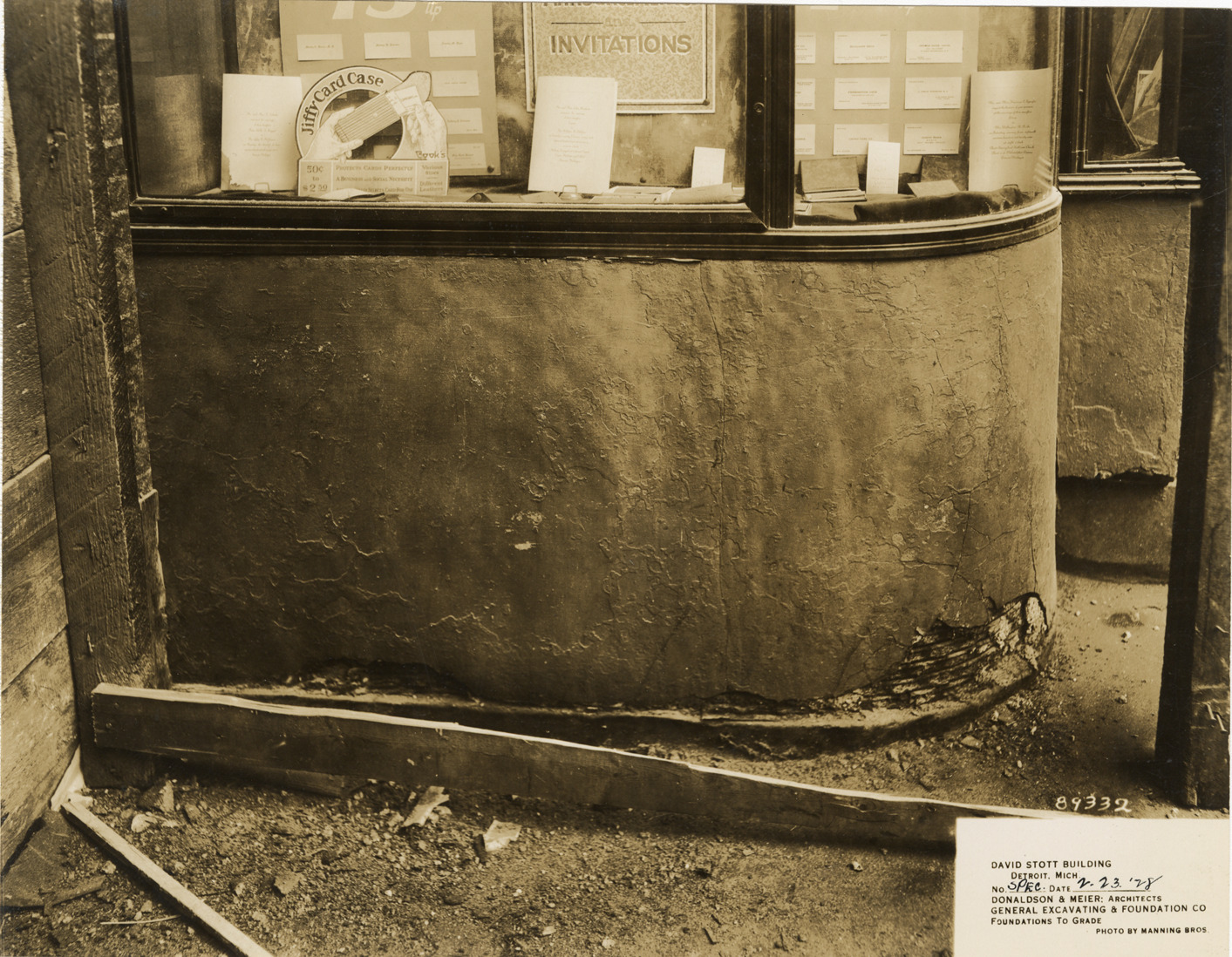 Partial view of display windows for the Detroit Numbering Machine Company located on Griswold St., adjacent to the construction site of the David Stott Building. Sample business cards and invitations are displayed in windows. The Stott Building was designed by Donaldson and Meier. Printed on front: "David Stott Building, Detroit, Mich. No. Spec. Date: 2-23-28. Donaldson & Meier, architects. General Excavating & Foundation Co. Foundations to grade. Photo by Manning Bros."