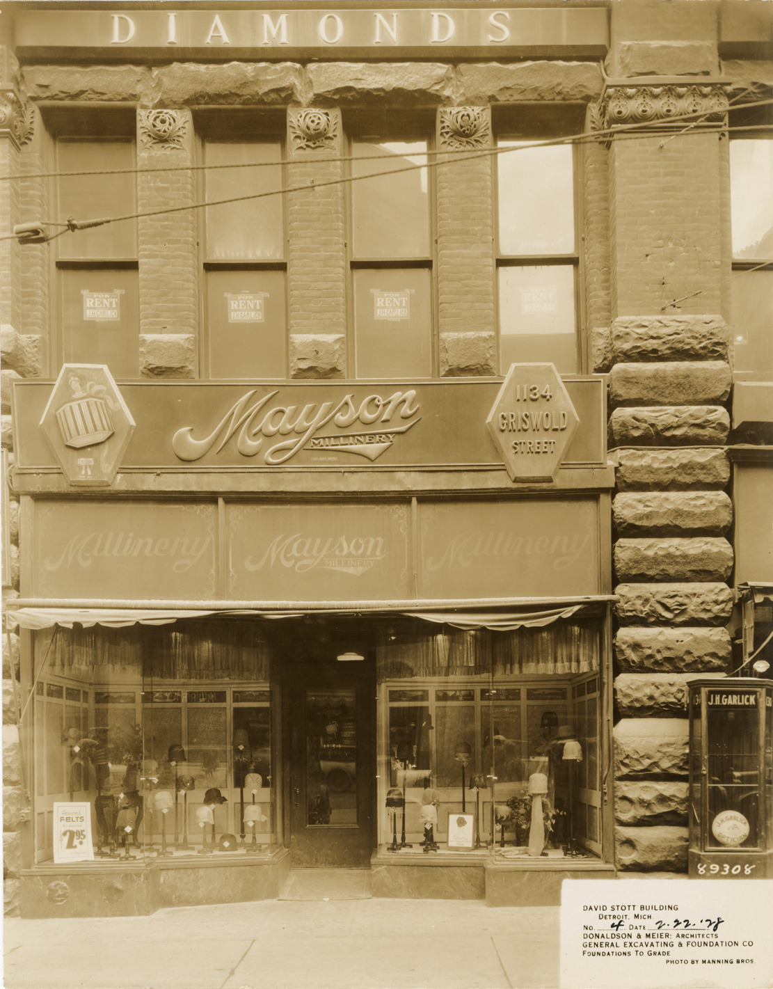 View of Mayson Millinery, located at 1134 Griswold St., adjacent to the construction site of the David Stott Building. Hats are displayed in windows. The Stott Building was designed by Donaldson and Meier. Printed on front: "David Stott Building, Detroit, Mich. No. 4. Date: 2-22-28. Donaldson & Meier, architects. General Excavating & Foundation Co. Foundations to grade. Photo by Manning Bros."