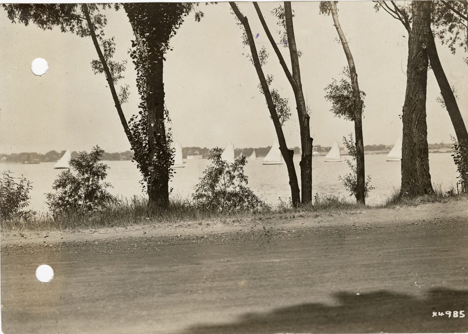 View through trees of sailboats on the Detroit River near the shore of Belle Isle. Stamped on back: "Spooner & Wells, Inc., photographers, 1231 Woodward Ave., Detroit, Mich., telephone North 1745." Handwritten on back: "Belle Isle. On Detroit River near Belle Isle."