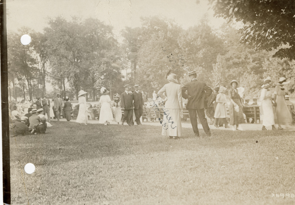 View of men and women strolling on footpath and sitting on benches near a canal on Belle Isle. Handwritten on back: "On Belle Isle, 1912."