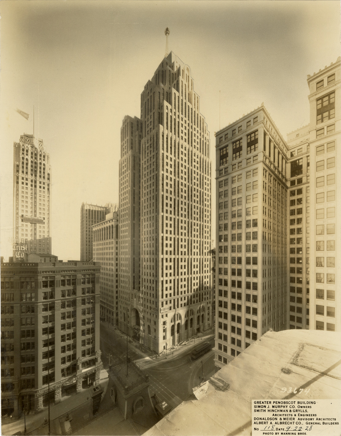 View of the Penobscot Building. Printed on front: "Greater Penobscot Building. Simon J. Murphy Co., owners. Smith Hinchman & Grylls, architects & engineers. Donaldson & Meier, advisory architects. Albert A. Albrecht Co., general builders. No. 118. Date: 9-22-28. Photo by Manning Bros."