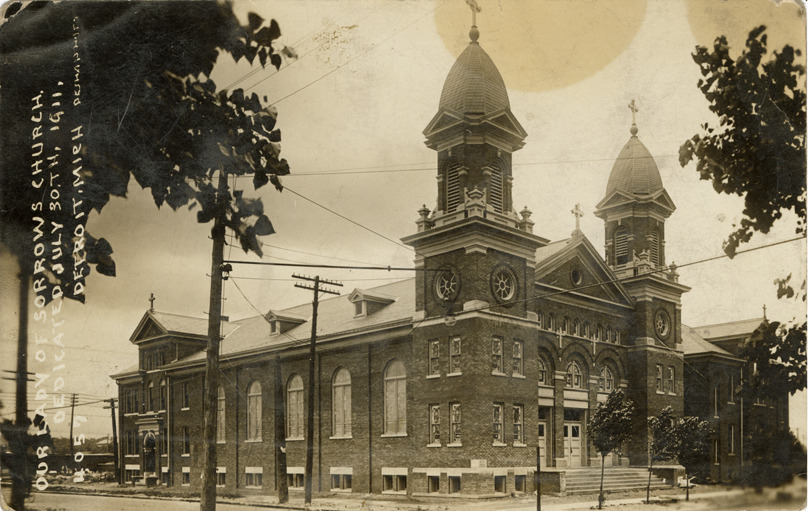 Favorite this☆ Our Lady of Sorrows Catholic Church Description: View of Our Lady of Sorrows Catholic Church in Detroit, Michigan. Printed on front: "Our Lady of Sorrows Church, dedicated July 30th, 1911, Detroit, Mich. Pesha photo." Details Resource ID: bh023978 Creator: Pesha, Louis James Subject: Catholic church buildings--Michigan--Detroit Photographers--Michigan Photographic prints Postcards Date Issued: Unknown year Format: 1 postcard ; 3.5 x 5.5 in. Member of: Burton Historical Collection Filing Location: D/Churches-R.C.-Our Lady of Sorrows Rights: Physical rights are retained by DPL. Copyright is retained in accordance with U.S. copyright laws.