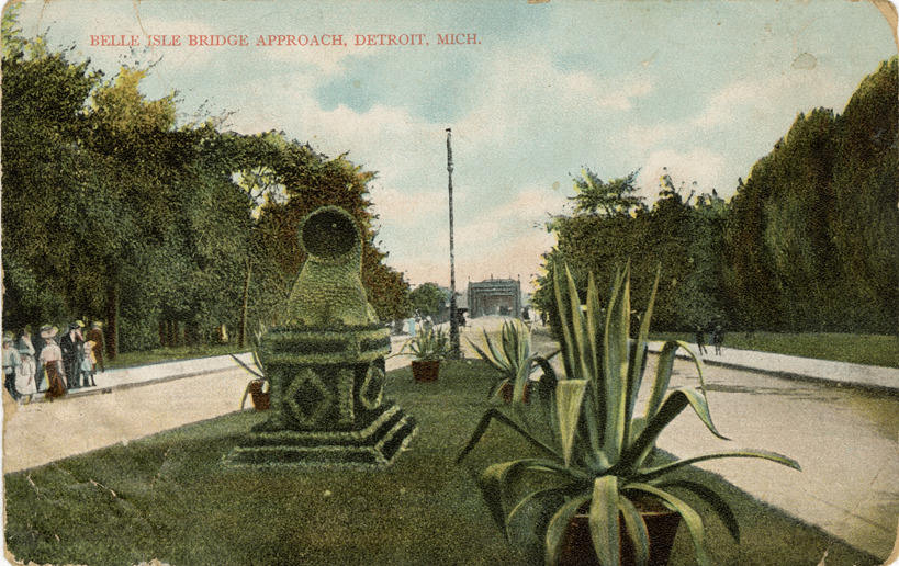 View of boulevard leading to Belle Isle bridge. Garden in foreground. Printed on front: "Belle Isle bridge approach, Detroit, Mich." Printed on back: "510. Wolverine News Co., Detroit, Mich. Printed in Germany."