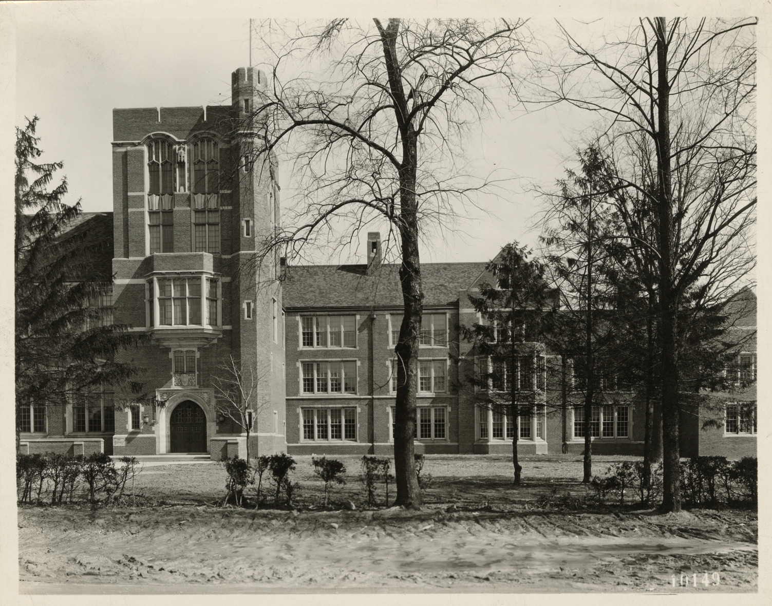 View of the Central High School in Flint, Michigan, designed by architects Malcomson and Higginbotham. Stamped on back: "A.F. Crooks, commercial photographer, Flint, Michigan." Handwritten on back: "Central High School, Flint, Mich. Malcomson & Higginbotham, architects."