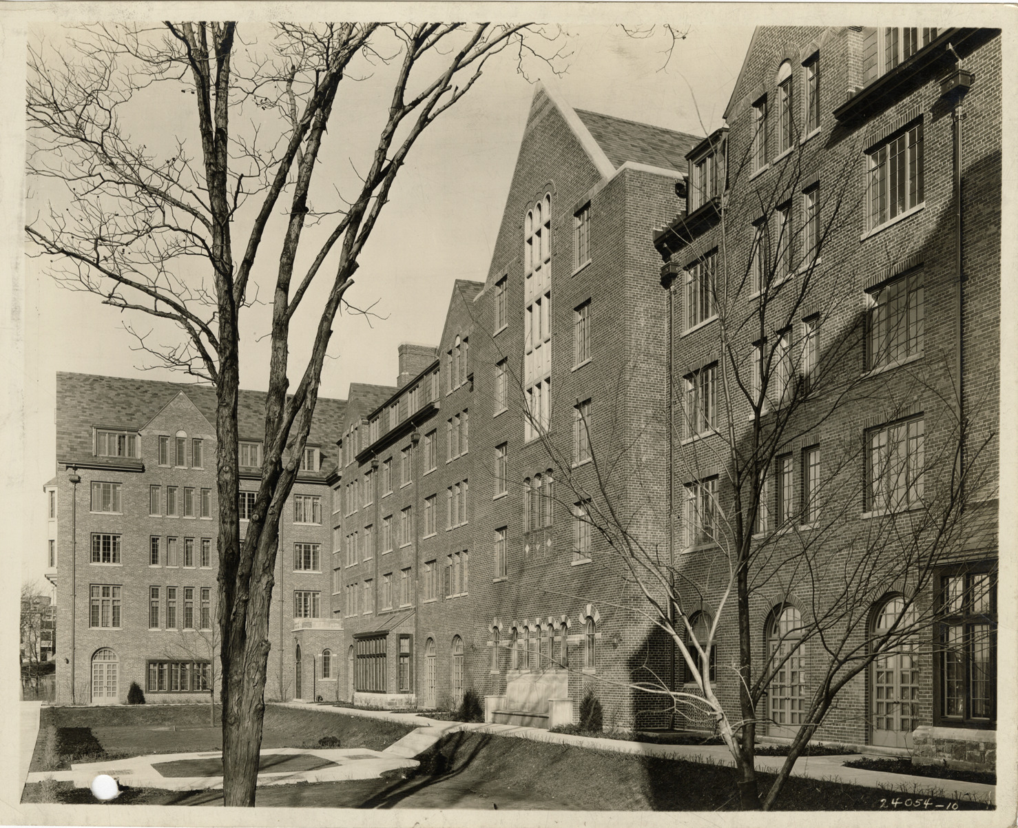 View of Mosher-Jordan Halls at the University of Michigan in Ann Arbor. Stamped on back: "A.F. Crooks, commercial photographer, Flint, Michigan." Handwritten on back: "Mosher-Jordan Halls. Malcomson & Higginbotham, architects."