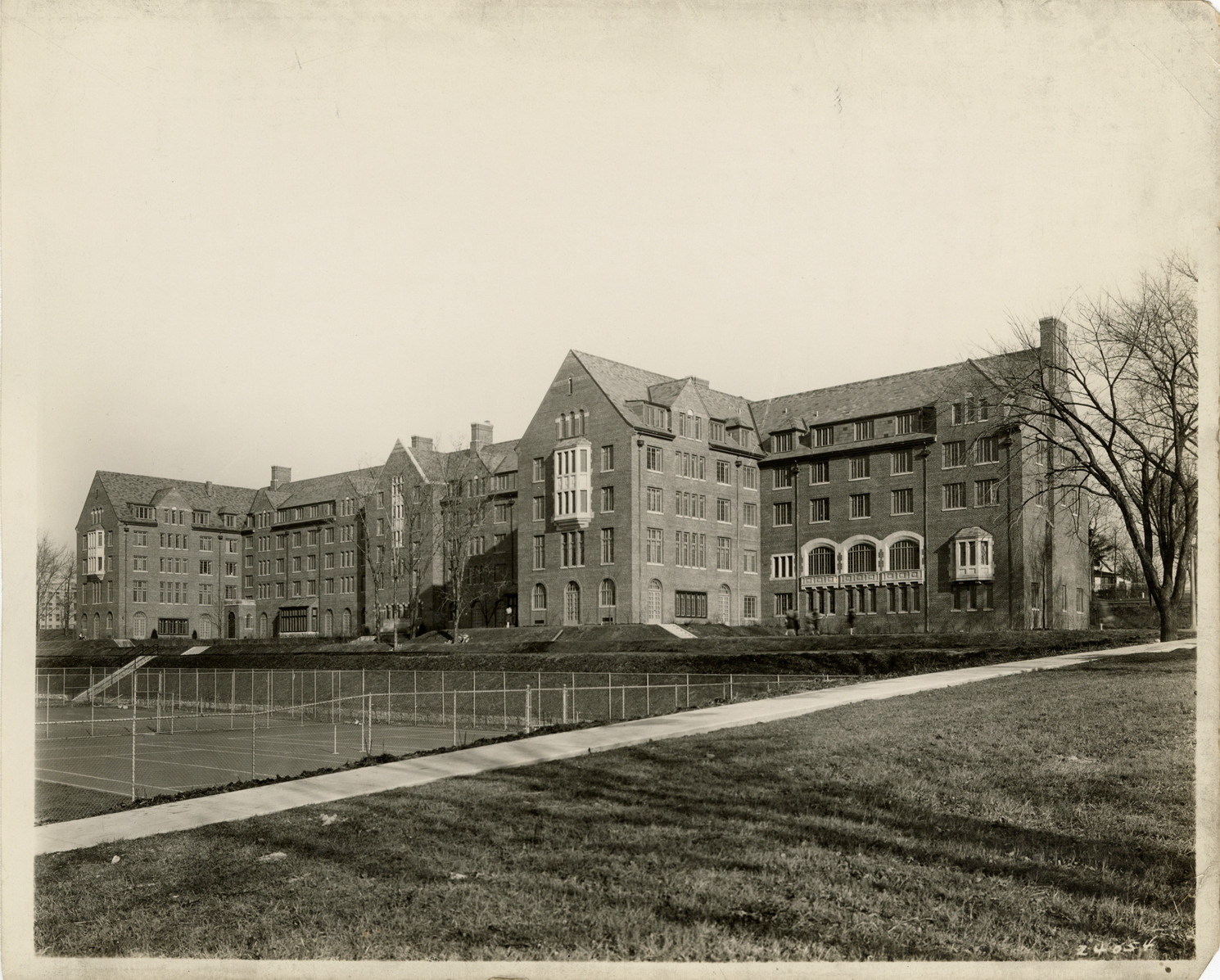 View of Mosher-Jordan Halls at the University of Michigan in Ann Arbor. Stamped on back: "A.F. Crooks, commercial photographer, Flint, Michigan." Handwritten on back: "U. of Mich. dorm. Ann Arbor dormitory. Mosher-Jordan Halls. Malcomson & Higginbotham."