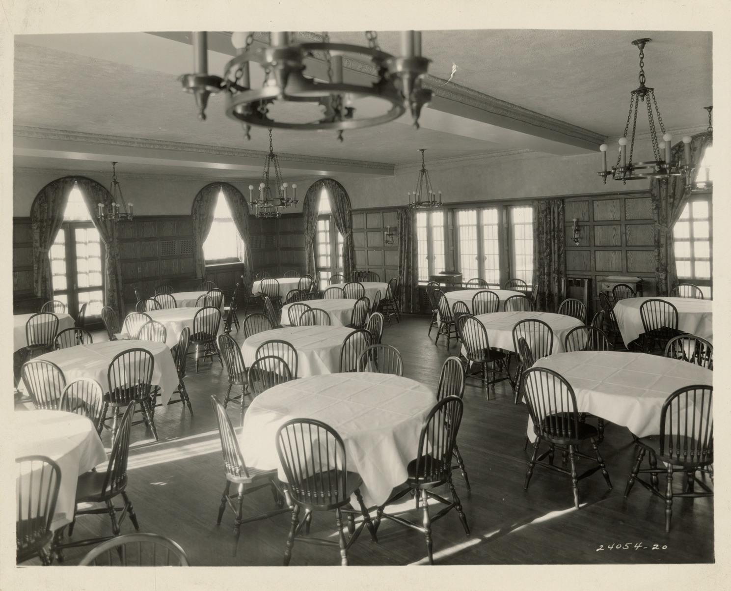 View of the dining room in the Mosher-Jordan Halls at the University of Michigan in Ann Arbor. Room is furnished with tables and chairs. Stamped on back: "A.F. Crooks, commercial photographer, Flint, Michigan." Handwritten on back: "Mosher-Jordan dorm at U. of M. Malcomson & Higginbotham, architects."