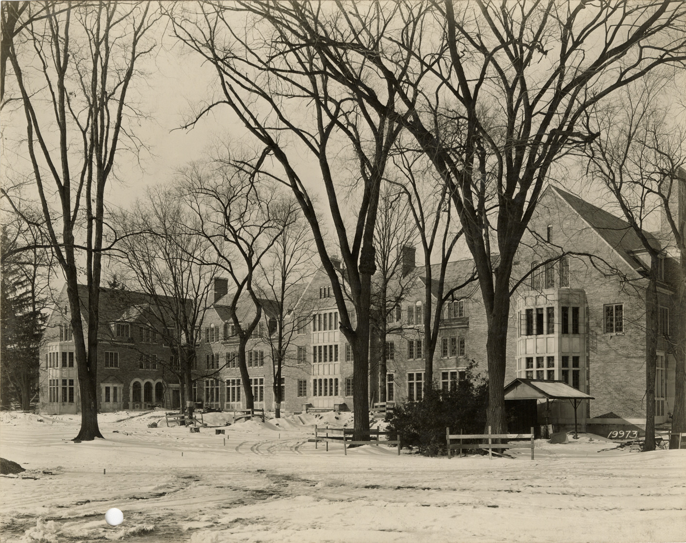 View of Mary May Hall, a dormitory at Michigan State University in East Lansing, designed by Malcomson, Higginbotham and Trout. Handwritten on back: "Michigan State College. Mary Mayo Hall, Michigan State University. Malcomson, Higginbotham & Trout, architects."