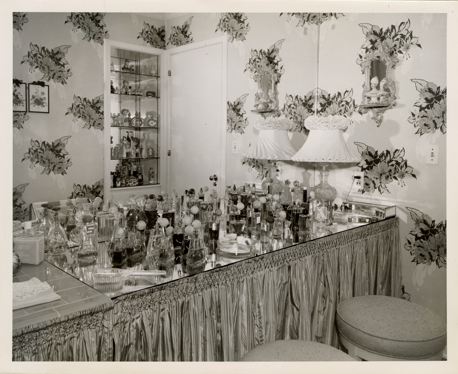 View of perfume bottles on a mirrored vanity in a house located on Lake Shore Rd. in Grosse Pointe Shores, Michigan. Stamped on back: "William E. Bradley, 14361 Royal Grand Ave., Detroit 23, Mich. KE. 2-4450."
