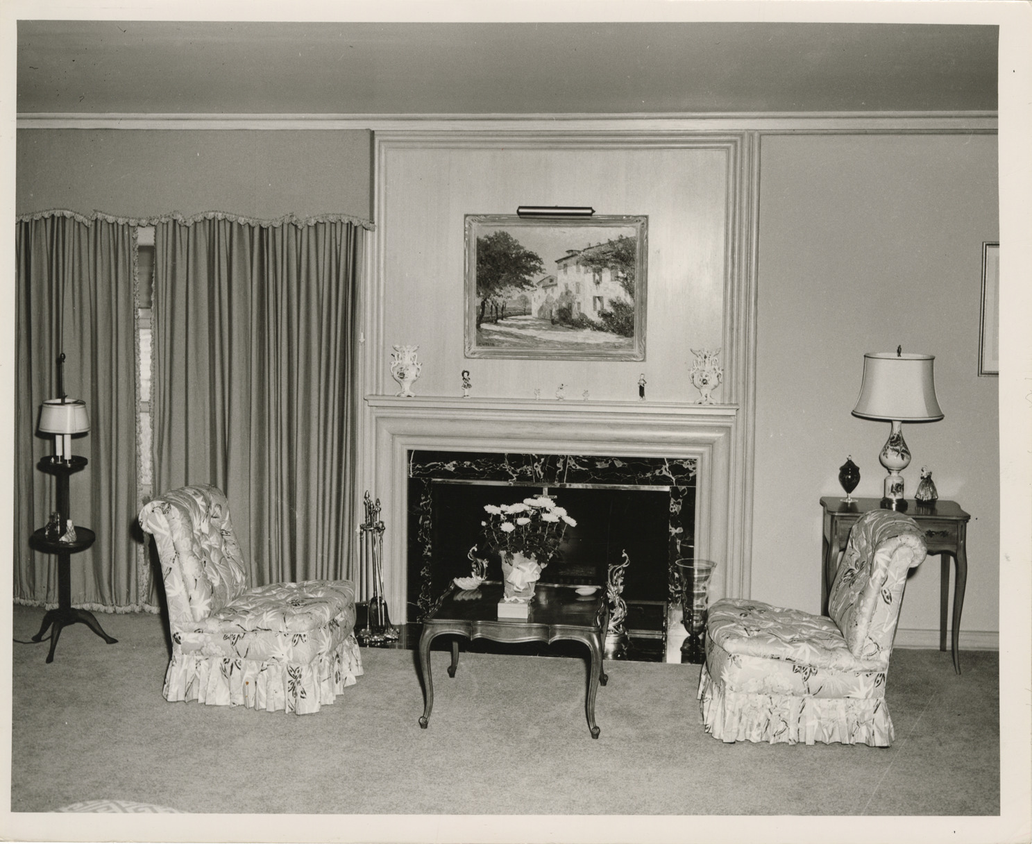 View of a living room in a house located on Lake Shore Rd. in Grosse Pointe Shores, Michigan. Room is furnished with chairs, coffee table and lamps. Fireplace in background. Painting is displayed over mantel. Stamped on back: "William E. Bradley, 14361 Royal Grand Ave., Detroit 23, Mich. KE. 2-4450."