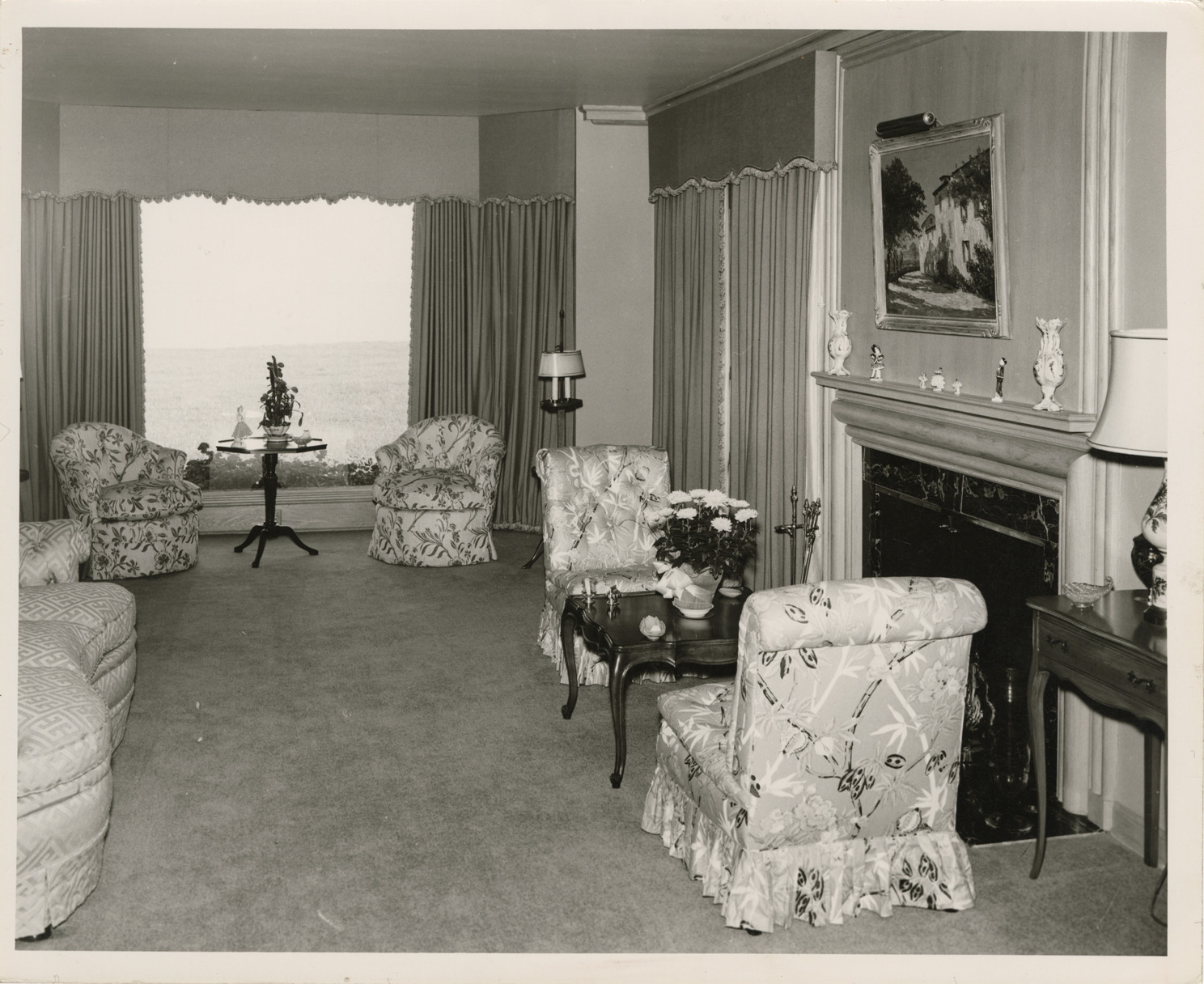 View of a living room in a house located on Lake Shore Rd. in Grosse Pointe Shores, Michigan. Room is furnished with chairs, coffee table and sofa. Fireplace is on right. Stamped on back: "William E. Bradley, 14361 Royal Grand Ave., Detroit 23, Mich. KE. 2-4450."