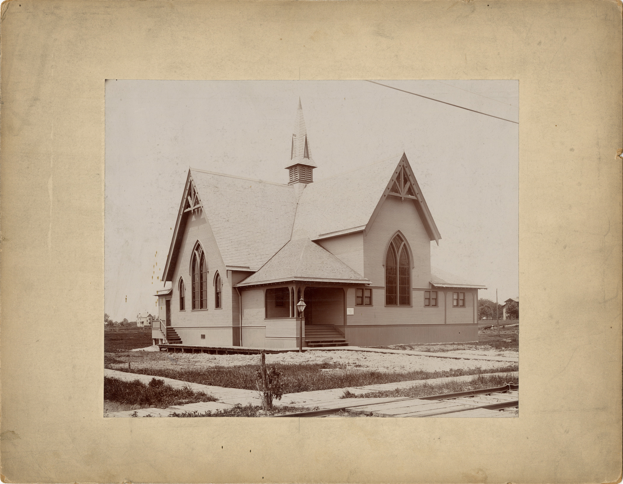 View of the Highland Park Presbyterian Church in Highland Park, Michigan. Sign on building reads: "Highland Park Presbyterian Church, 1896." Stamped on back: "A. Godfrey & Co., commercial photographers. 41 W. Fort Street, Detroit, Mich." Handwritten on back: "H.P. Presbyterian."