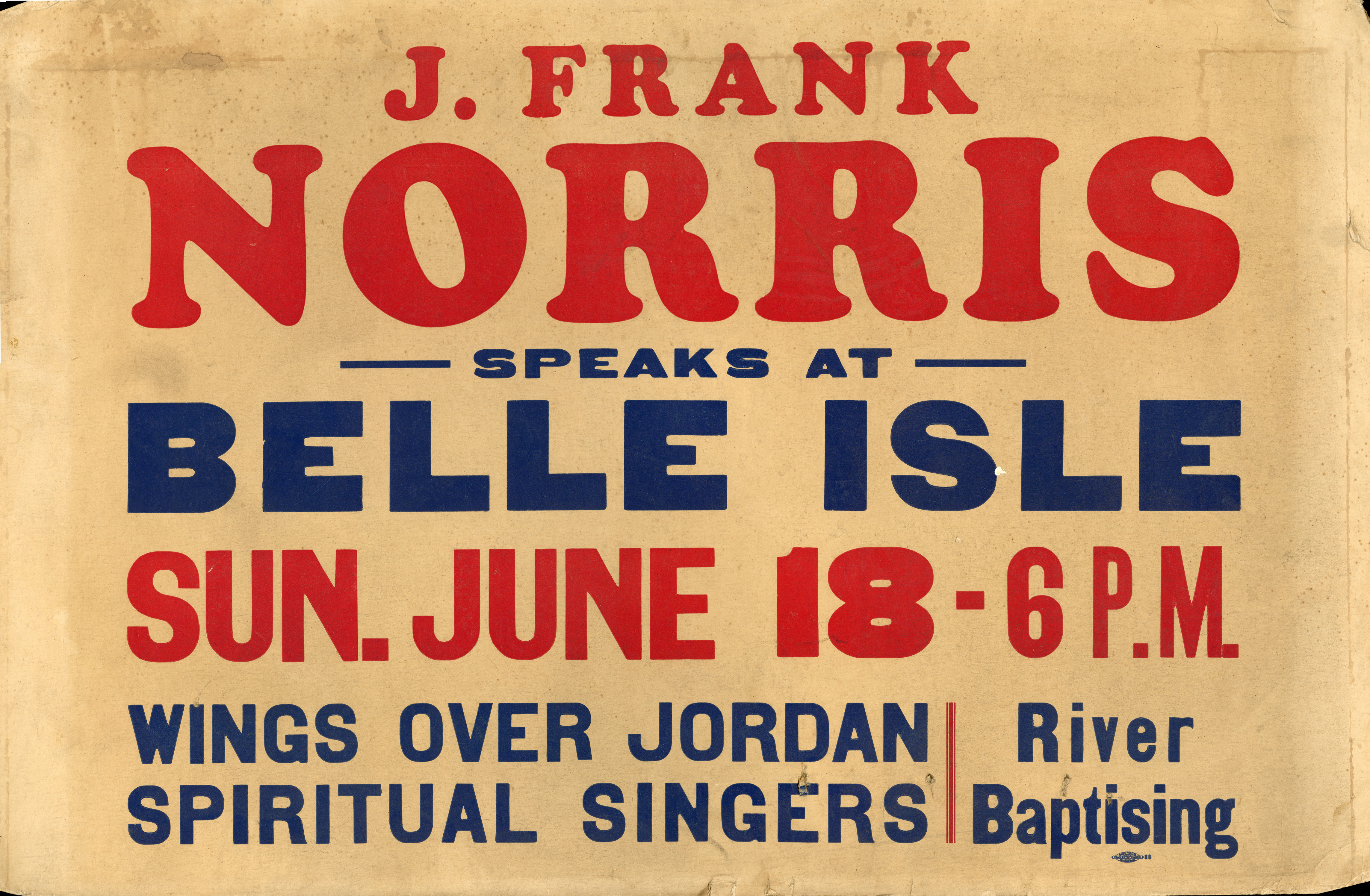 Sign advertising Baptist preacher J. Frank Norris speaking at Belle Isle. Printed on sign: "J. Frank Norris speaks at Belle Isle. Sun. June 18, 6 p.m. Wings over Jordan spiritual singers. River baptising."