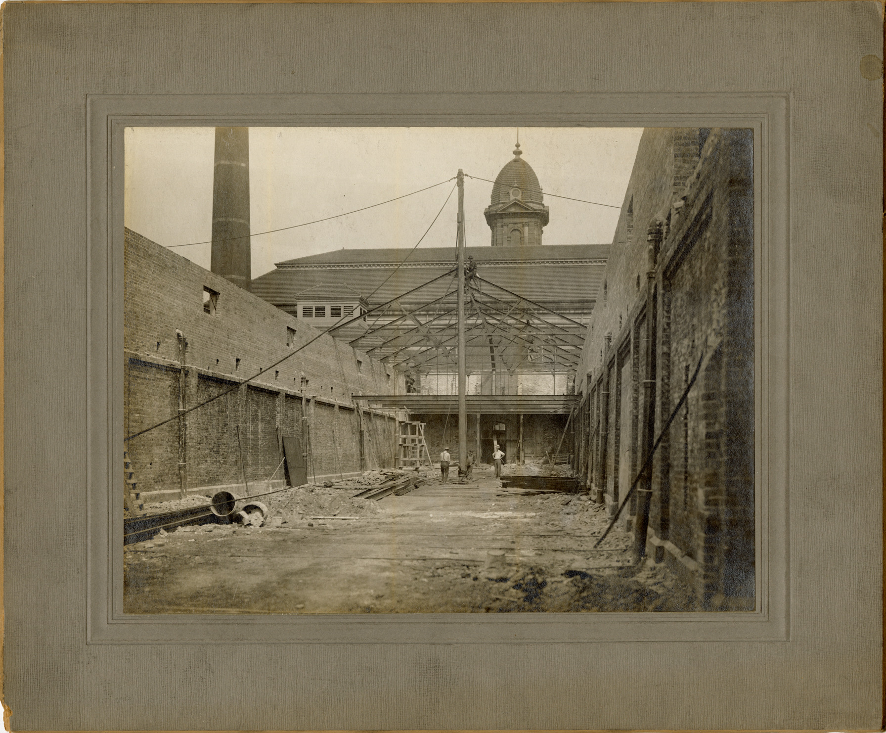 View of workers erecting roof trusses for coal shed at Waterworks Park, Detroit water supply system. Handwritten on back: "8-14-1908. Coal shed, erecting roof trusses."