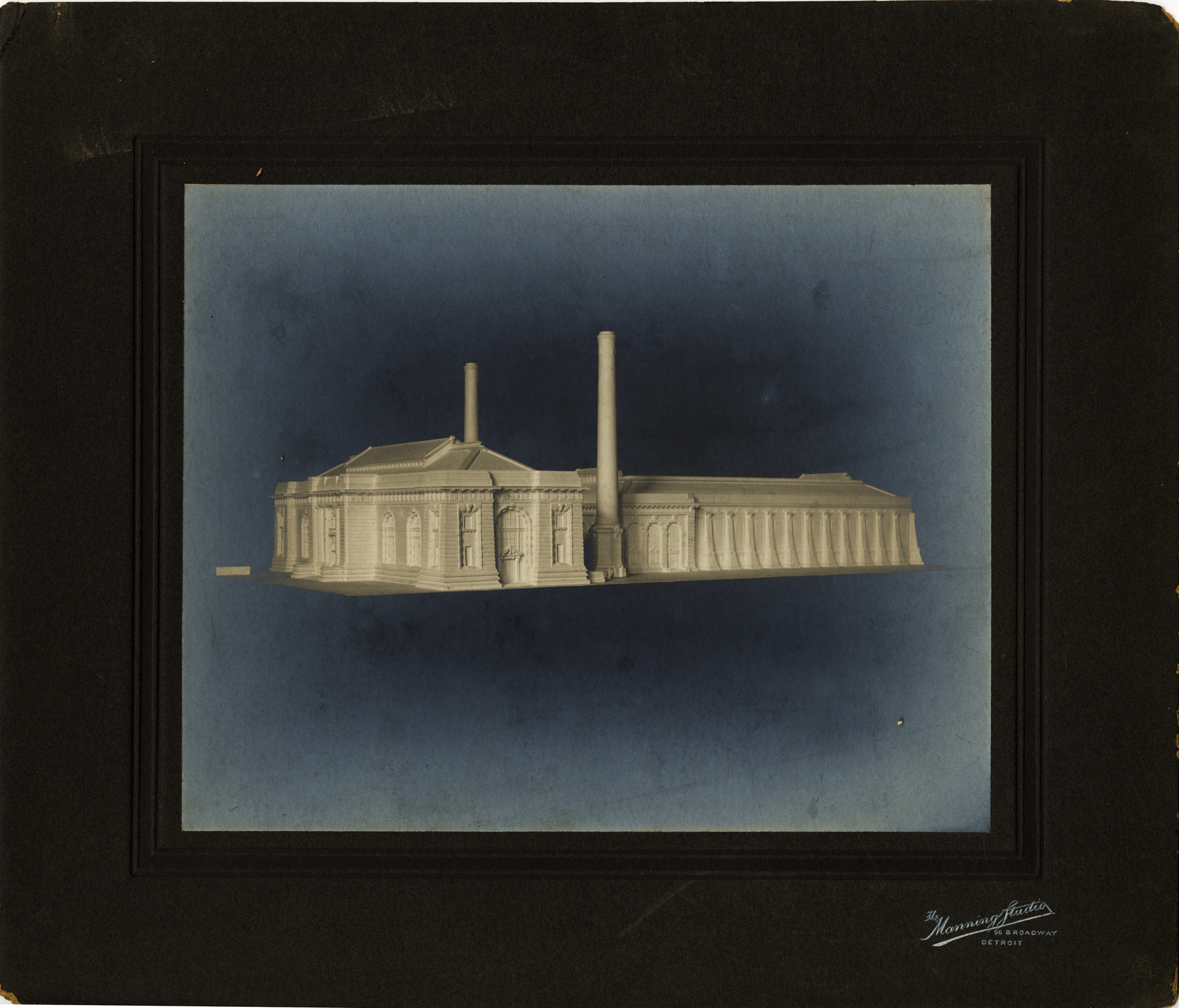 View of an architectural model for a pumping station at Waterworks Park, Detroit water supply system. Printed on front: "The Manning Studio, 96 Broadway, Detroit."