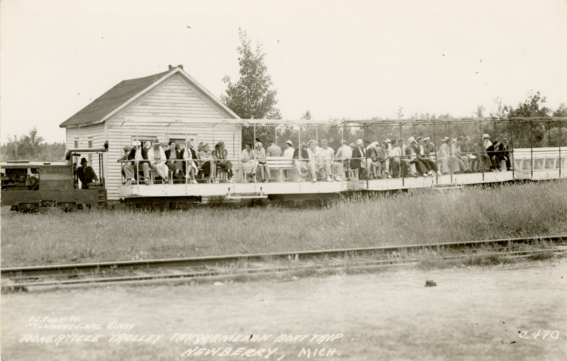 View of passengers on the Toonerville Trolley at Newberry, Michigan. Printed on front: "Toonerville Trolley, Tahquamenon boat trip, Newberry, Mich. L.L. Cook Co., Milwaukee, Wis. [copyright] 1939." Printed on back: "All rights reserved. The L.L. Cook Co., Milwaukee."