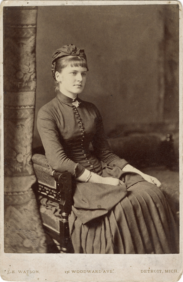 Portrait of Margaret Stansbury. Printed on front: "J.E. Watson, 236 Woodward Ave., Detroit, Mich." Printed on back: "J.E. Watson, Detroit, Mich." Handwritten on back: "Margaret Stansbury."