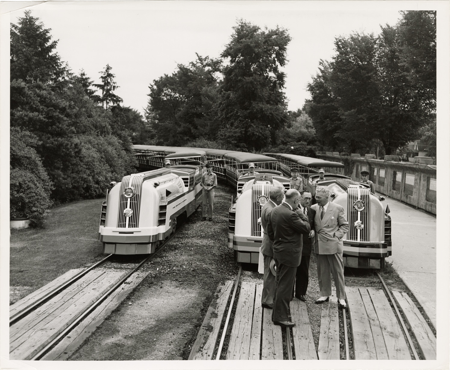 View of dignitaries standing in front of locomotives for the Detroit Zoo miniature railroad -- named the "Walter P. Chrysler," "Walter O. Briggs" and "William E. Scripps." Conductors pose in background. The three train railroad was established in 1931. From left to right: B.E. Hutchinson, [unknown], Albert E. Cobo, Frank G. McInnis.