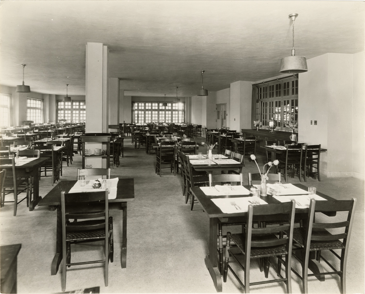 View of the main dining room at the Women's City Club of Detroit building. Room is furnished with tables and chairs. Stamped on back: "Manning Bros., commercial photographers. 504-505 Lincoln Building. Corner State and Park Sts., Detroit, Mich." Handwritten on back: "Main dining room."