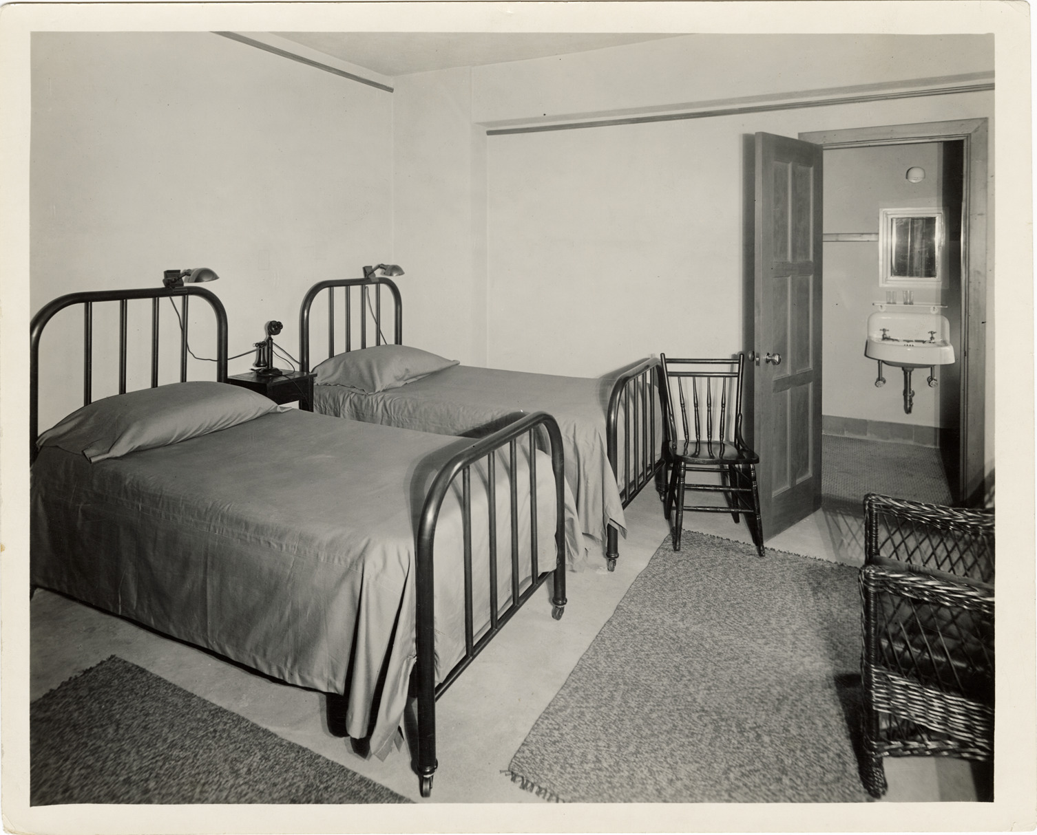 View of a bedroom in the Women's City Club of Detroit building. Room is furnished with two beds, chairs and a telephone. Bathroom sink is visible in background. Stamped on back: "Smith Brothers, commercial photographers. Arcadia Bldg., Woodward & Stimson, Detroit, Mich."