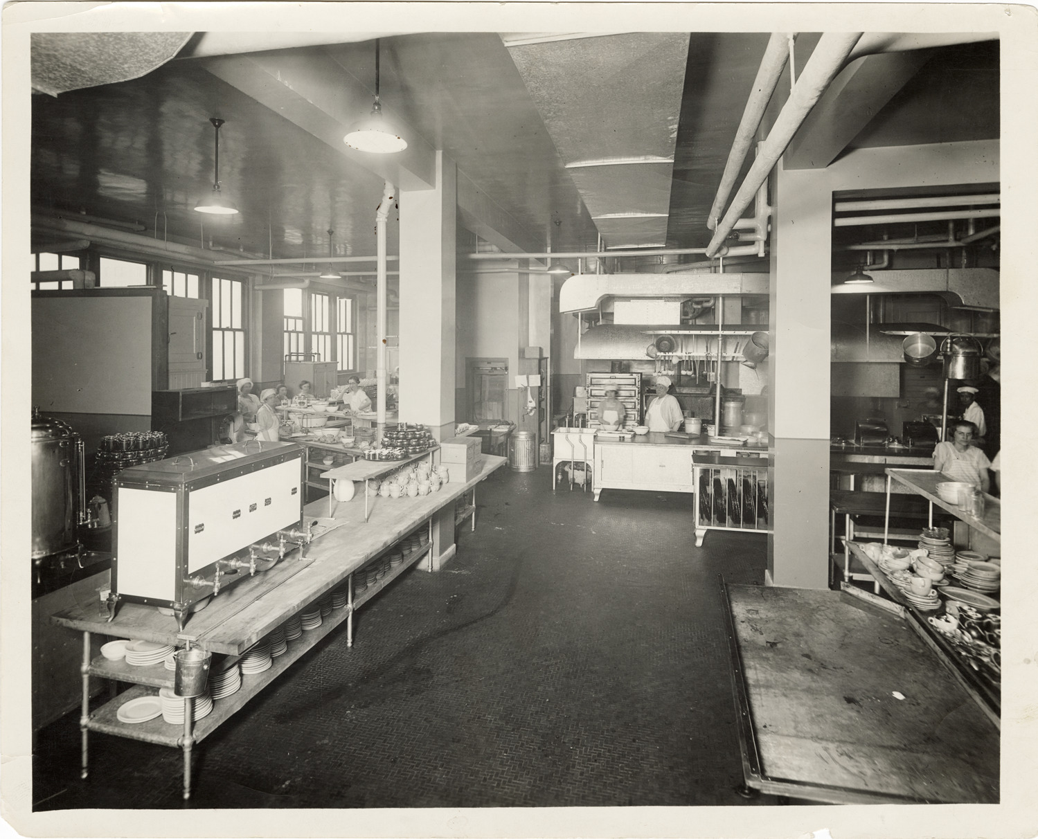 View of the kitchen at the Women's City Club of Detroit building. Cups, plates and beverage dispensers in foreground; kitchen staff and equipment in background. Stamped on back: "Smith Brothers, commercial photographers. Arcadia Bldg., Woodward & Stimson, Detroit, Mich."