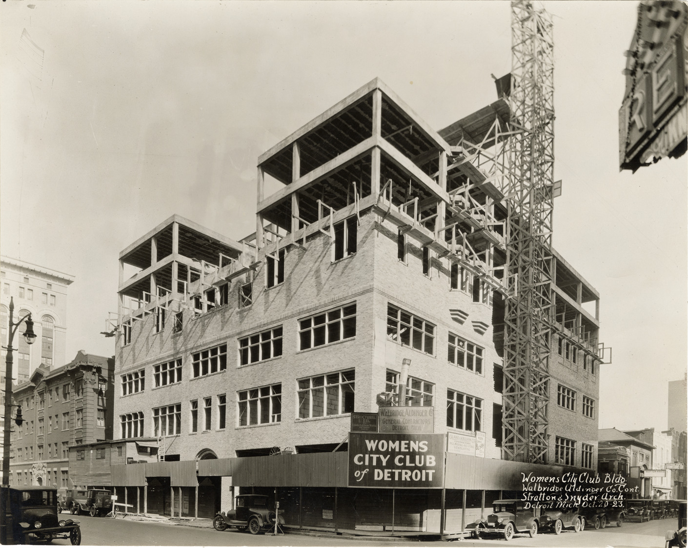 View of the Women's City Club of Detroit building during construction. Printed on front: "Womens City Club Bldg. Walbridge Aldinger Co., cont. Stratton & Snyder, arch. Detroit, Mich., Oct. 20, 23." Stamped on back: "Spencer & Wyckoff, commercial photographers. Smith Bldg., Detroit."