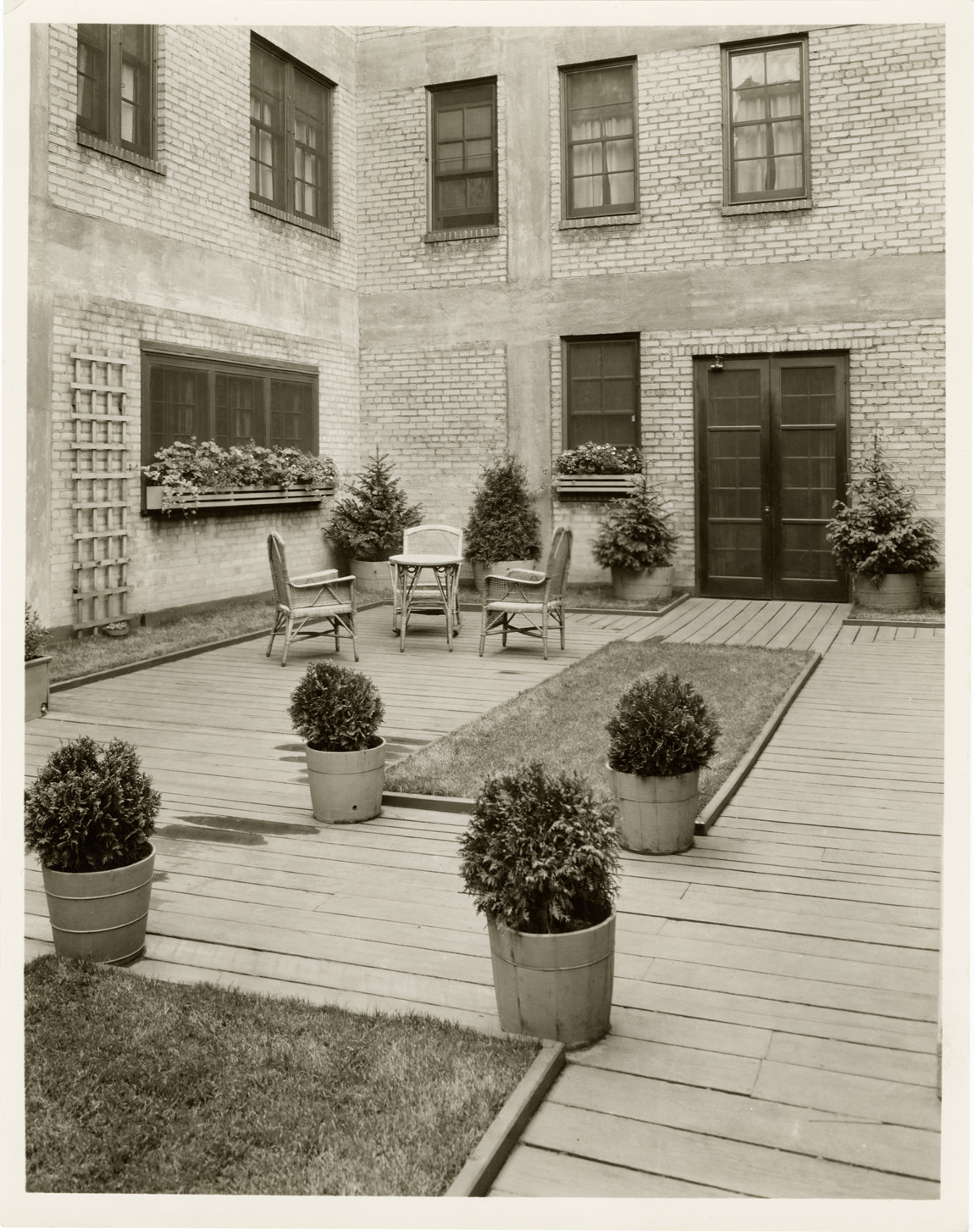 Favorite this☆ Courtyard, Women's City Club of Detroit Description: View of the courtyard at the Women's City Club of Detroit building. Courtyard has table and chairs, potted shrubs, plots of grass and window boxes. Stamped on back: "Geo. W. Hance." Details Resource ID: bh024311 Creator: Hance, George W. Subject: Courtyards--Michigan--Detroit Women's City Club (Detroit, Mich.) Clubhouses--Michigan--Detroit Women--Societies and clubs Women's City Club (Detroit, Mich.)--Archives Photographers--Michigan--Detroit Photographic prints Date Issued: Unknown year Format: 1 photographic print ; 9.75 x 7.75 in. Member of: Burton Historical Collection Filing Location: MS/Women's City Club of Detroit, 4:3 Rights: Physical rights are retained by DPL. Copyright is retained in accordance with U.S. copyright laws.