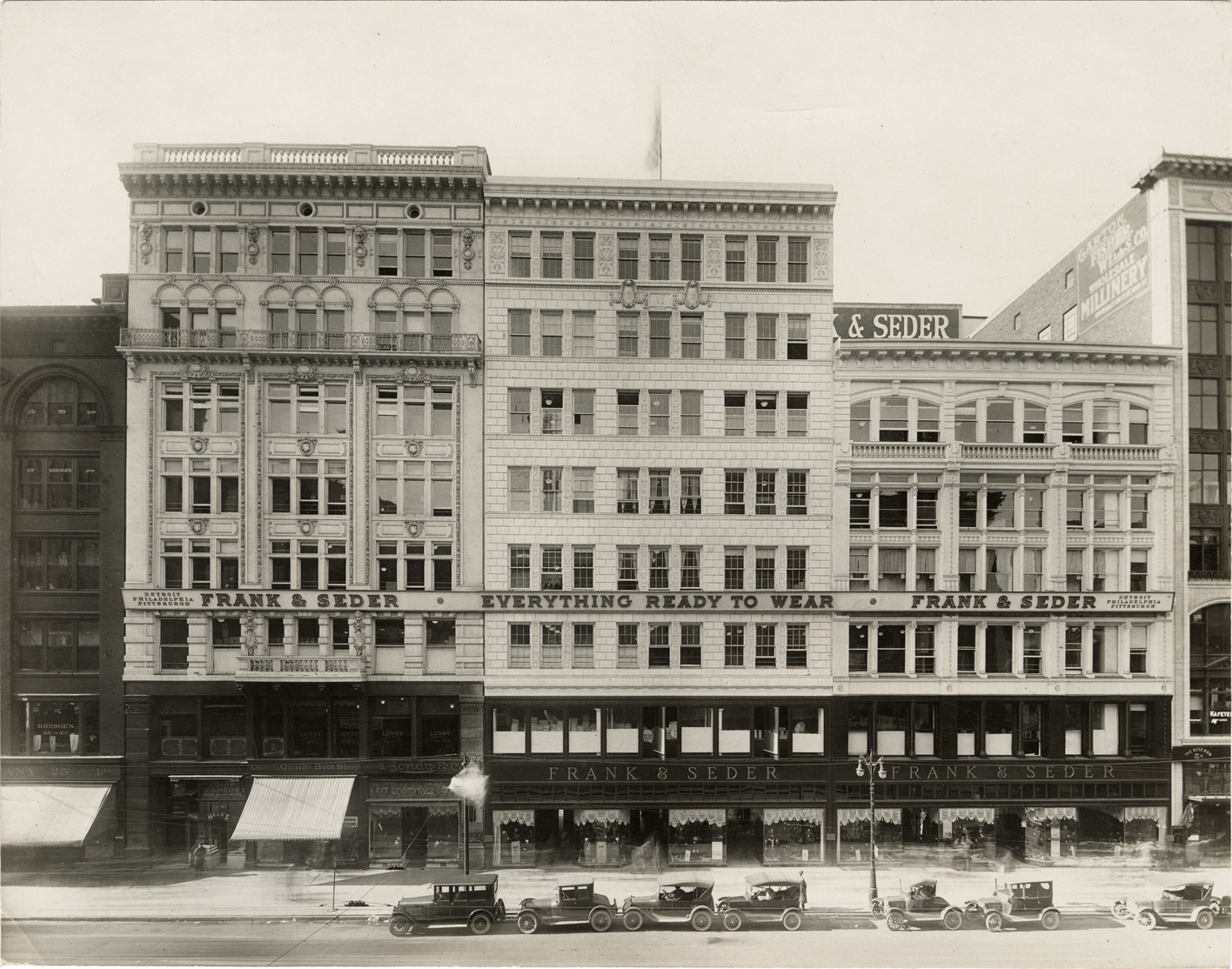 Favorite this☆ Frank & Seder department store Description: View of the Frank & Seder department store on Woodward Ave. Cars are parked in front of building. Handwritten on back: "Woodward Avenue (west side) between Grand River & State St." Details Resource ID: bh024312 Subject: Department stores--Michigan--Detroit Woodward Avenue (Mich.) Streets--Michigan--Detroit Automobiles--Michigan--Detroit Photographic prints Date Issued: Unknown year Format: 1 photographic print mounted on fabric ; 7.5 x 9.5 in. Member of: Burton Historical Collection Filing Location: D/Industries and business houses--Frank & Seder Rights: Physical rights are retained by DPL. Copyright is retained in accordance with U.S. copyright laws.