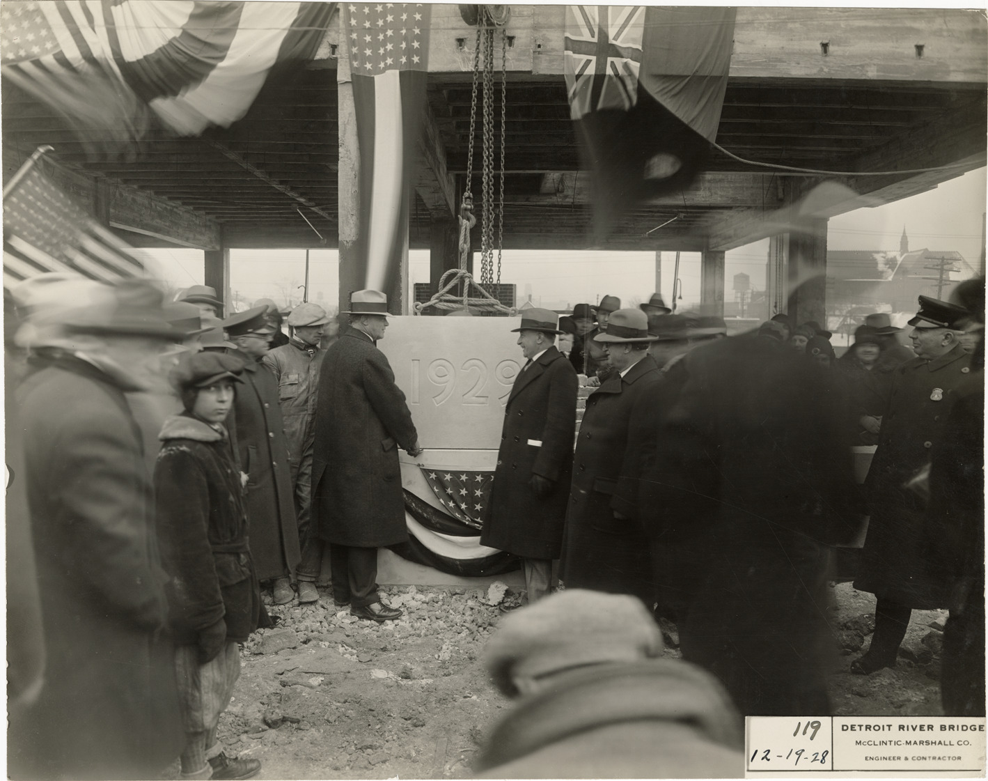 View of officials C.D. Ferguson and J.W. Austin and crowd at the cornerstone laying of the Ambassador Bridge. "1929" is inscribed on cornerstone. Printed on front: "119, 12-19-28 [sic]. Detroit River Bridge. McClintic-Marshall Co., engineer & contractor." Handwritten on back: "Dedication of bridge."