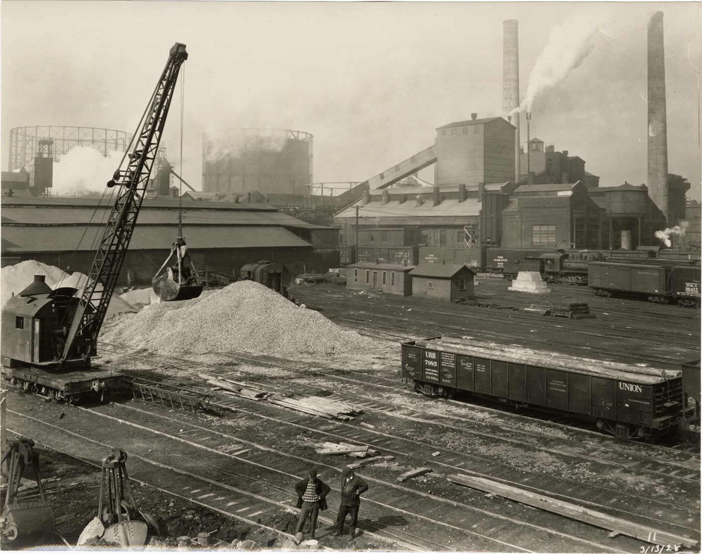 Favorite this☆ Railroad yard and factory, Ambassador Bridge during construction Description: View of railroad yard and factory, Ambassador Bridge during construction. Crane on left; freight car on right. Printed on front: "11, 3/13/28." Details Resource ID: bh024332 Subject: Ambassador Bridge (Detroit, Mich., and Windsor, Ont.) Suspension bridges--Design and construction Factories Railroad yards Cranes, derricks, etc. Freight cars Photographic prints Date Issued: 1928-03-13 Format: 1 photographic print mounted on fabric ; 7.5 x 9.5 in. Member of: Burton Historical Collection Filing Location: D/Bridges-Ambassador-Construction-March 1928 Rights: Physical rights are retained by DPL. Copyright is retained in accordance with U.S. copyright laws.