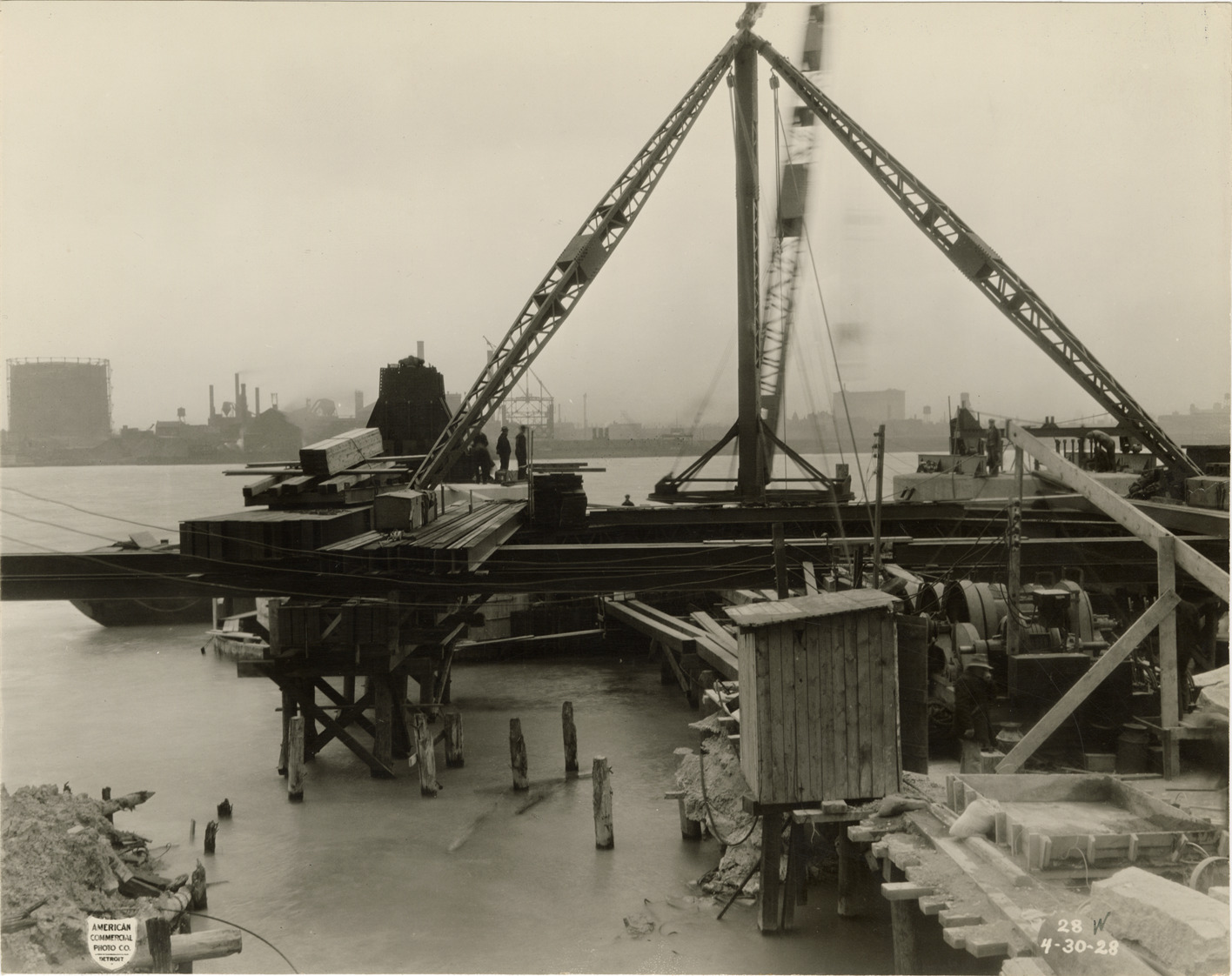 View of a construction site and equipment at the edge of the Detroit River for the Ambassador Bridge. Printed on front: "28W, 4-30-28. American Commercial Photo Co., Detroit."