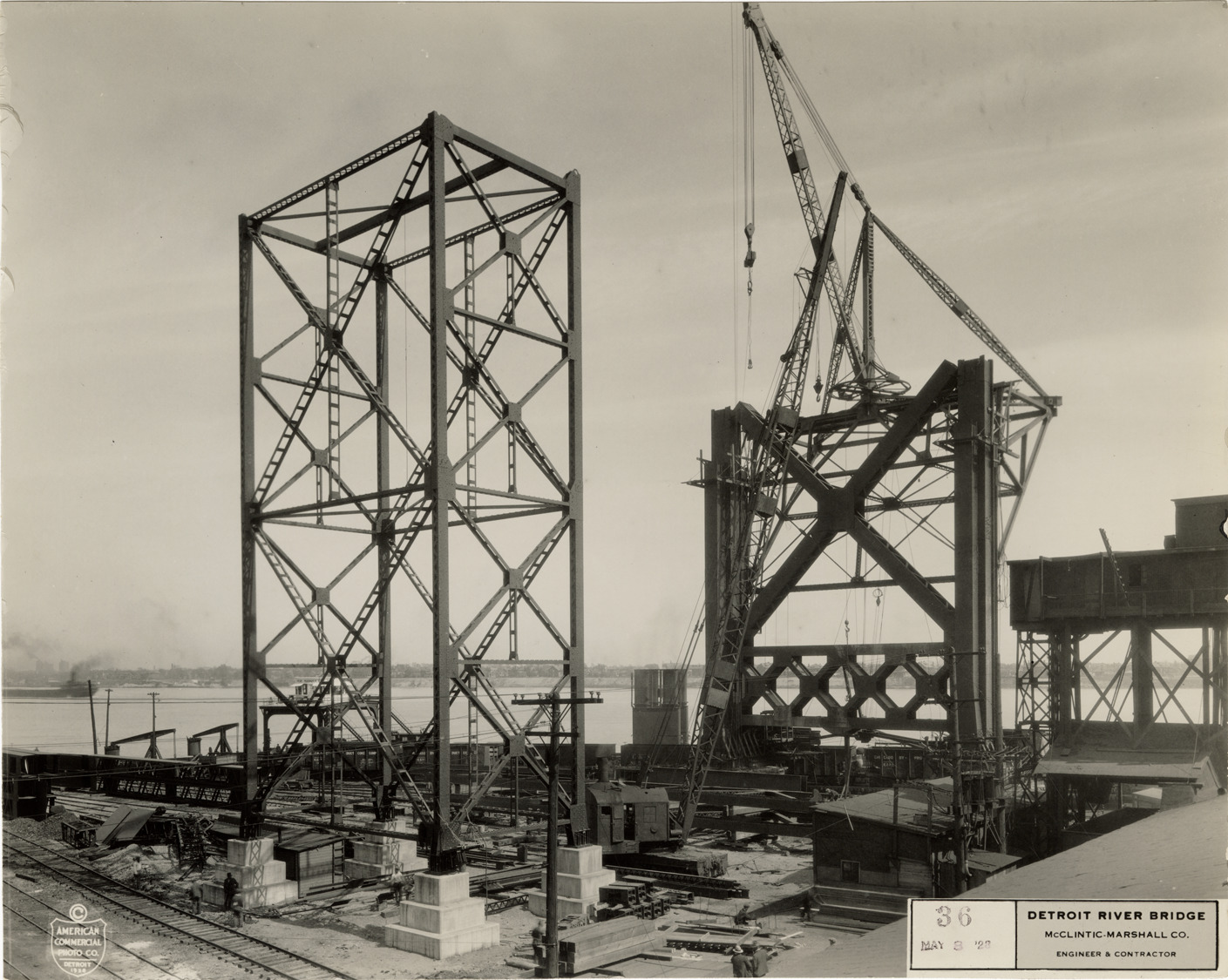 View of the Ambassador Bridge during construction, showing structural framework and crane. Printed on front: "36, May 8 '28. Detroit River Bridge, McClintic-Marshall Co., engineer & contractor. [copyright] American Commercial Photo Co., Detroit, 1928."