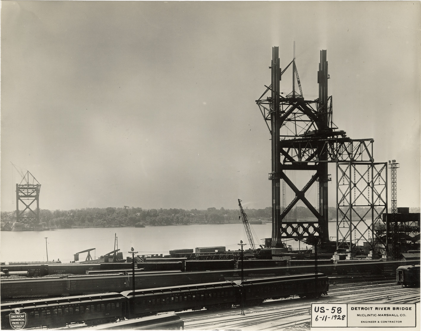 View of the Ambassador Bridge during construction. Railroad yard in foreground; Detroit River in background. Printed on front: "[copyright] American Commercial Photo Co., Detroit 1928. US-58, 6-11-1928. Detroit River Bridge, McClintic-Marshall Co., engineer & contractor."