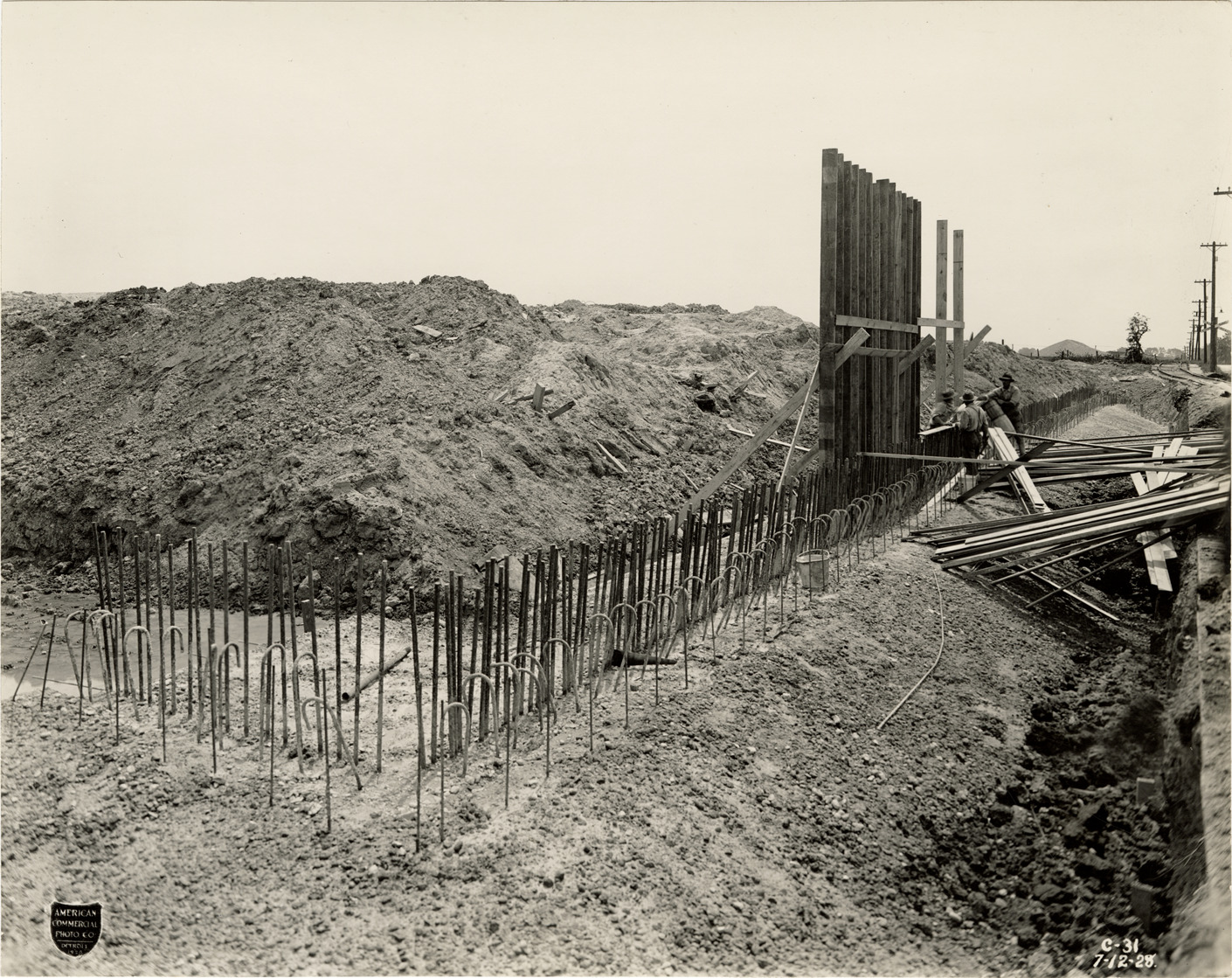 Favorite this☆ Construction site, Ambassador Bridge Description: View of a construction site for the Ambassador Bridge, showing rebar and workers. Printed on front: "American Commercial Photo Co., Detroit 1928. C-31, 7-12-28." Details Resource ID: bh024386 Creator: American Commercial Photo Co. Subject: Reinforcing bars Construction workers Ambassador Bridge (Detroit, Mich., and Windsor, Ont.) Suspension bridges--Design and construction McClintic-Marshall Construction Company Photographers--Michigan--Detroit Photographic prints Date Issued: 1928-07-12 Format: 1 photographic print mounted on fabric ; 7.5 x 9.5 in. Member of: Burton Historical Collection Filing Location: D/Bridges-Ambassador-Construction-July 1928 Rights: Physical rights are retained by DPL. Copyright is retained in accordance with U.S. copyright laws.