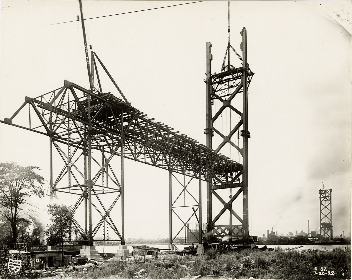 Favorite this☆ Ambassador Bridge during construction Description: View of the Ambassador Bridge during construction on the Detroit River, showing structural framework. Printed on front: "[copyright] American Commercial Photo Co., Detroit 1928. C-32, 7-20-28." Details Resource ID: bh024387 Creator: American Commercial Photo Co. Subject: Structural frames Ambassador Bridge (Detroit, Mich., and Windsor, Ont.) Suspension bridges--Design and construction McClintic-Marshall Construction Company Photographers--Michigan--Detroit Photographic prints Date Issued: 1928-07-20 Format: 1 photographic print mounted on fabric ; 7.5 x 9.5 in. Member of: Burton Historical Collection Filing Location: D/Bridges-Ambassador-Construction-July 1928 Rights: Physical rights are retained by DPL. Copyright is retained in accordance with U.S. copyright laws.