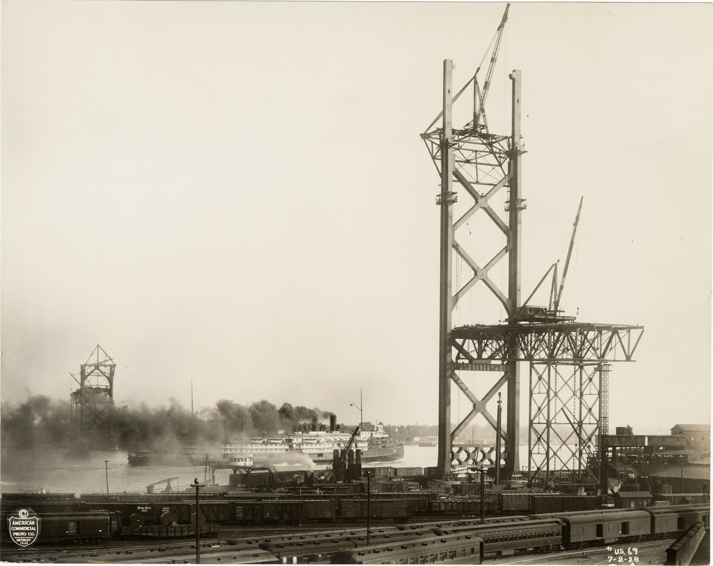 Favorite this☆ Ambassador Bridge during construction Description: View of the Ambassador Bridge during construction, showing structural framework. Railroad yard in foreground; ferry in background. Printed on front: "[copyright] American Commercial Photo Co., Detroit 1928. #U.S. 69, 7-2-28." Details Resource ID: bh024389 Creator: American Commercial Photo Co. Subject: Structural frames Ferries Railroad yards Ambassador Bridge (Detroit, Mich., and Windsor, Ont.) Suspension bridges--Design and construction McClintic-Marshall Construction Company Photographers--Michigan--Detroit Photographic prints Date Issued: 1928-07-02 Format: 1 photographic print mounted on fabric ; 7.5 x 9.5 in. Member of: Burton Historical Collection Filing Location: D/Bridges-Ambassador-Construction-July 1928 Rights: Physical rights are retained by DPL. Copyright is retained in accordance with U.S. copyright laws.