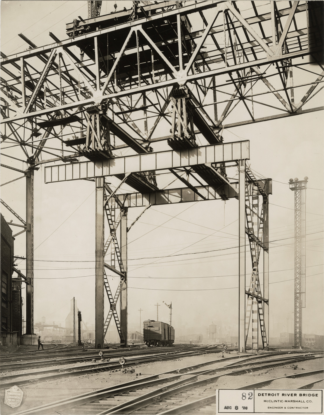 View of the Ambassador Bridge during construction, showing structural framework. Freight car in background. Printed on front: "[copyright] American Commercial Photo Co., Detroit 1928. 82, Aug. 8, '28. Detroit River Bridge, McClintic-Marshall Co., engineer & contractor."