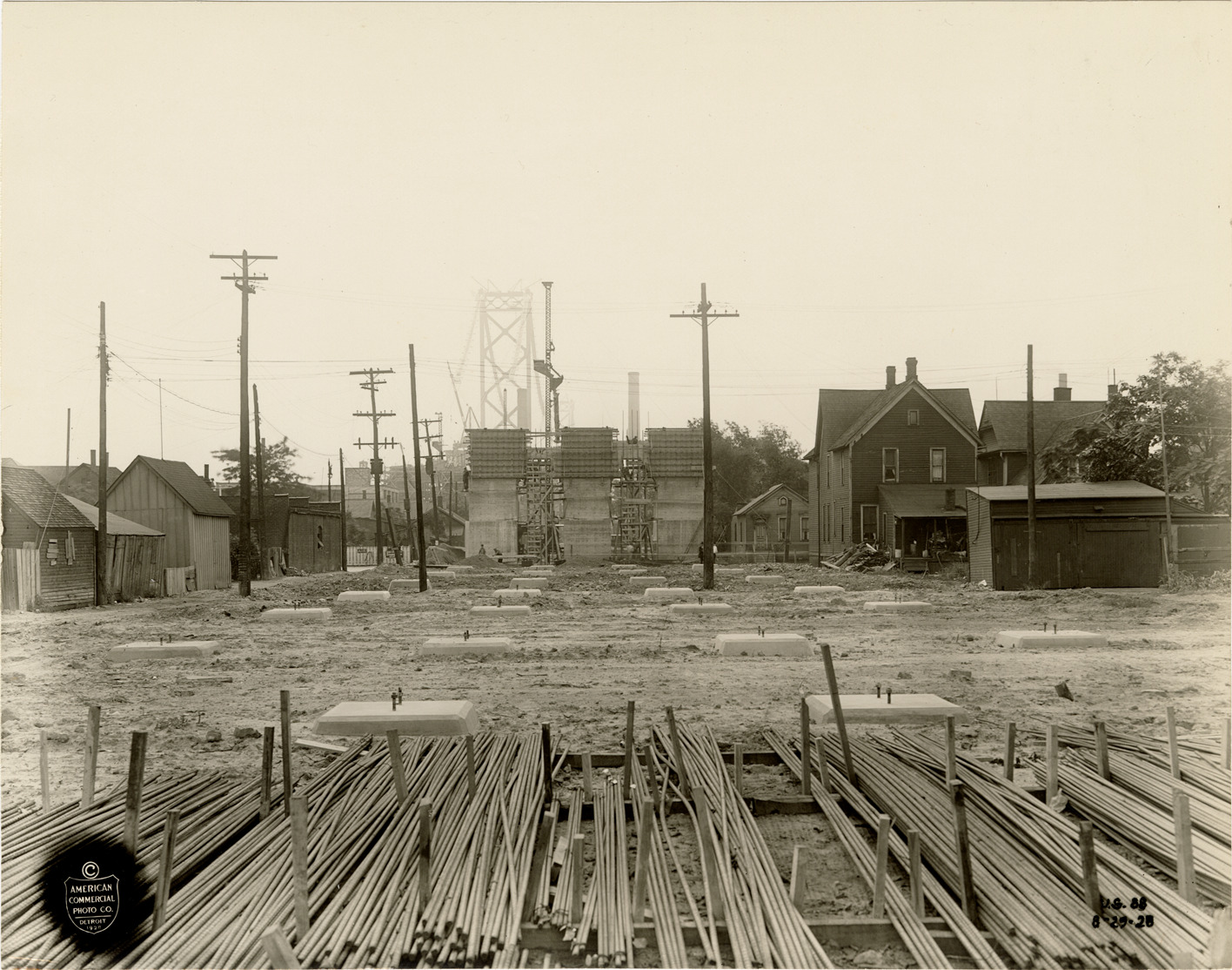 View of a construction site for the Ambassador Bridge. Houses and concrete footings in background. Printed on front: "[copyright] American Commercial Photo Co., Detroit 1928. U.S. 88, 8-29-28."