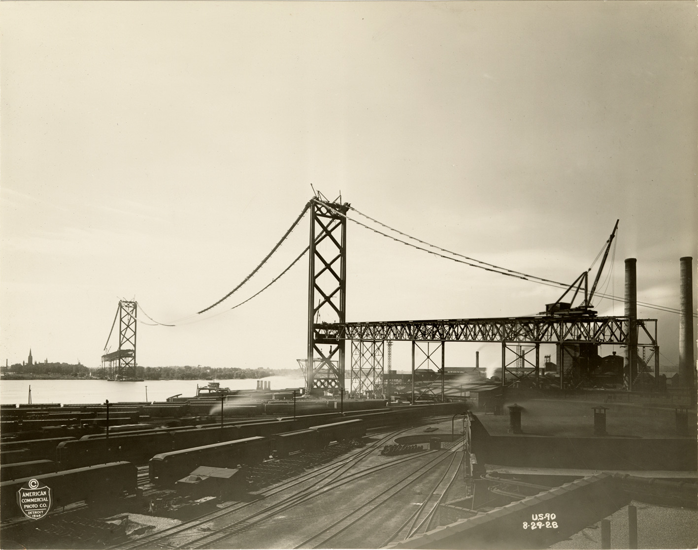 Favorite this☆ Ambassador Bridge during construction Description: View of the Ambassador Bridge during construction. Railroad yard in foreground; Detroit River in background. Printed on front: "[copyright] American Commercial Photo Co., Detroit 1928. US-90, 8-29-28." Details Resource ID: bh024429 Creator: American Commercial Photo Co. Subject: Ambassador Bridge (Detroit, Mich., and Windsor, Ont.) Suspension bridges--Design and construction Railroad yards McClintic-Marshall Construction Company Photographers--Michigan--Detroit Photographic prints Date Issued: 1928-08-29 Format: 1 photographic print mounted on fabric ; 7.5 x 9.5 in. Member of: Burton Historical Collection Filing Location: D/Bridges-Ambassador-Construction-August 1928 Rights: Physical rights are retained by DPL. Copyright is retained in accordance with U.S. copyright laws.