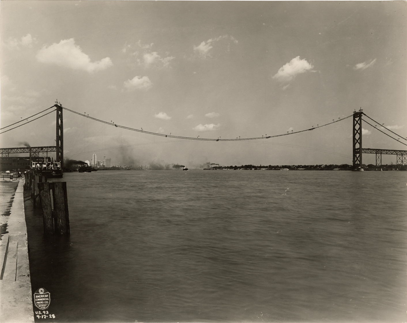 Favorite this☆ Ambassador Bridge during construction Description: View of the Ambassador Bridge during construction. Detroit River in foreground. Printed on front: "[copyright] American Commercial Photo Co., Detroit 1928. U.S. 93, 9-17-28." Details Resource ID: bh024433 Creator: American Commercial Photo Co. Subject: Ambassador Bridge (Detroit, Mich., and Windsor, Ont.) Suspension bridges--Design and construction Detroit River (Mich. and Ont.) McClintic-Marshall Construction Company Photographers--Michigan--Detroit Photographic prints Date Issued: 1928-09-17 Format: 1 photographic print mounted on fabric ; 7.5 x 9.5 in. Member of: Burton Historical Collection Filing Location: D/Bridges-Ambassador-Construction-September 1928 Rights: Physical rights are retained by DPL. Copyright is retained in accordance with U.S. copyright laws.
